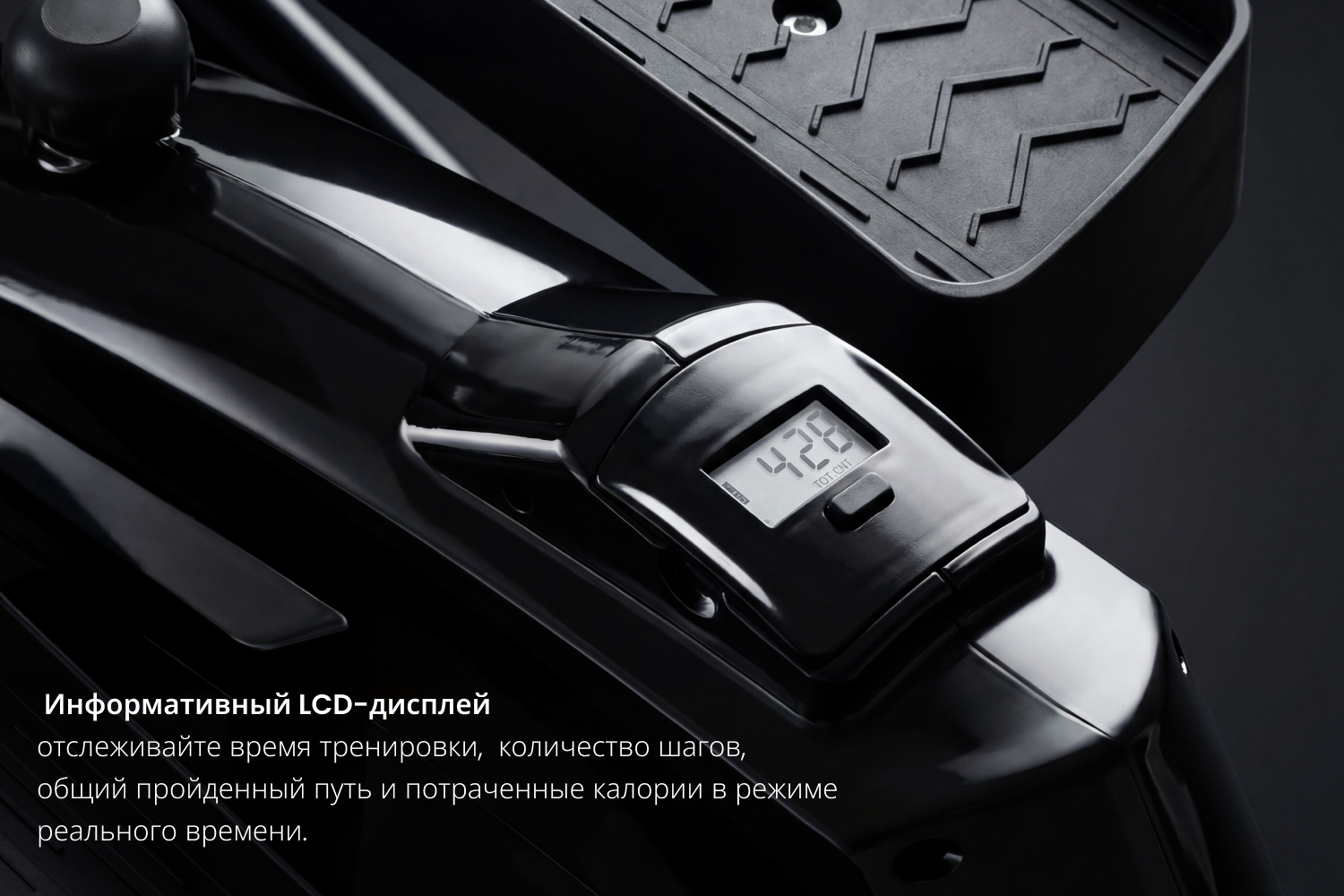 Информативный LCD-дисплей – отслеживайте время тренировки, количество шагов, общий пройденный путь и потраченные калории в режиме реального времени.