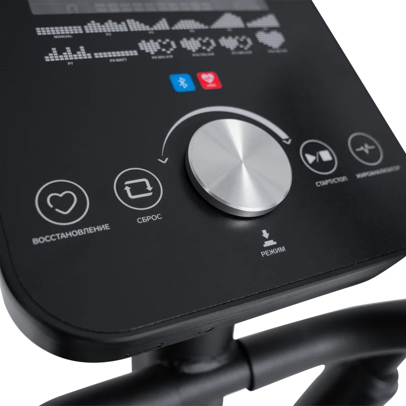 Консоль с LED-дисплеем белой индикации отображает время, скорость, дистанцию, пульс, уровень нагрузки, калории и обороты. С 12 программами тренировок, включая ручной режим, предустановленные и пульсозависимые, вы сможете разнообразить свои занятия. Возможность подключения к тренировочным мобильным приложениям (Kinomap™, Fitshow™) через Bluetooth добавляет элемент интерактивности и мотивации.