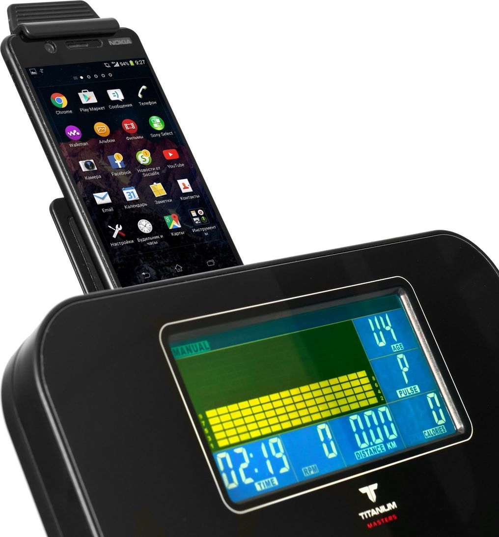 - Показания консоли программный профиль, уровни нагрузки, время, дистанция, скорость, калории, обороты в мин., пульс, ватты
