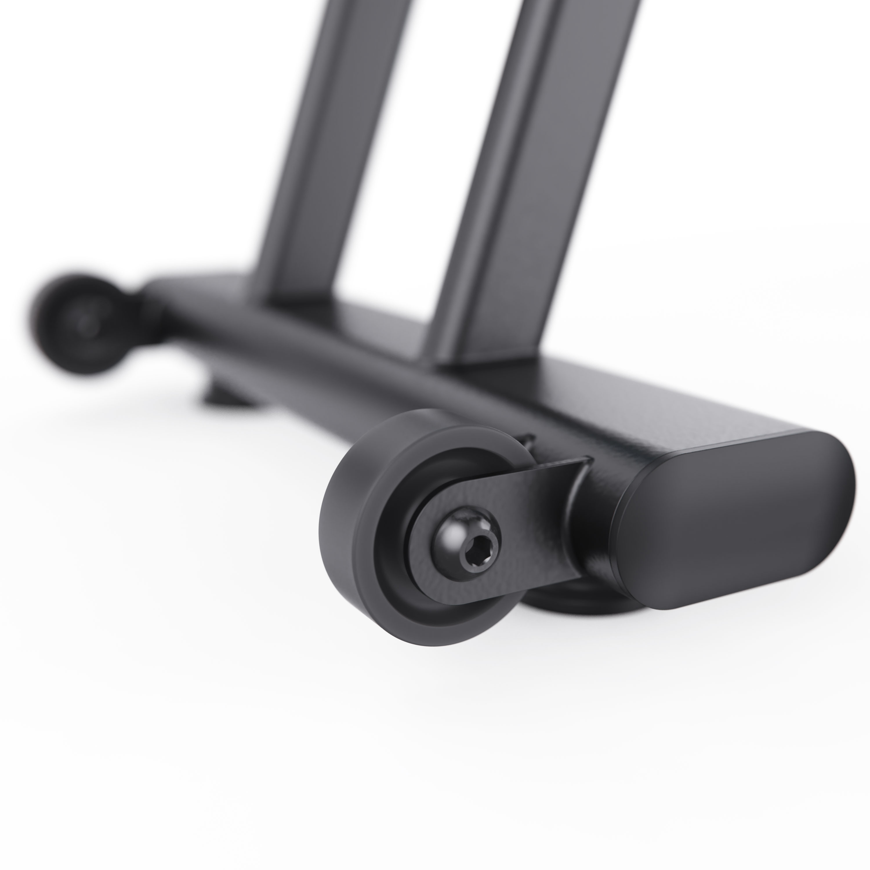 Увеличенные рифленые педали с регулируемыми ремешками обеспечивают надежную фиксацию ног, а подставка под планшет позволяет использовать устройства для удобства тренировки. Прочная направляющая обеспечивает плавное и стабильное движение, подходящее для пользователей ростом до 190 см. Регулируемый держатель снижает нагрузку на шею, также есть компенсаторы неровности пола, которые гарантируют стабильность тренажера, а транспортировочные колеса позволяют легко перемещать тренажер по помещению.