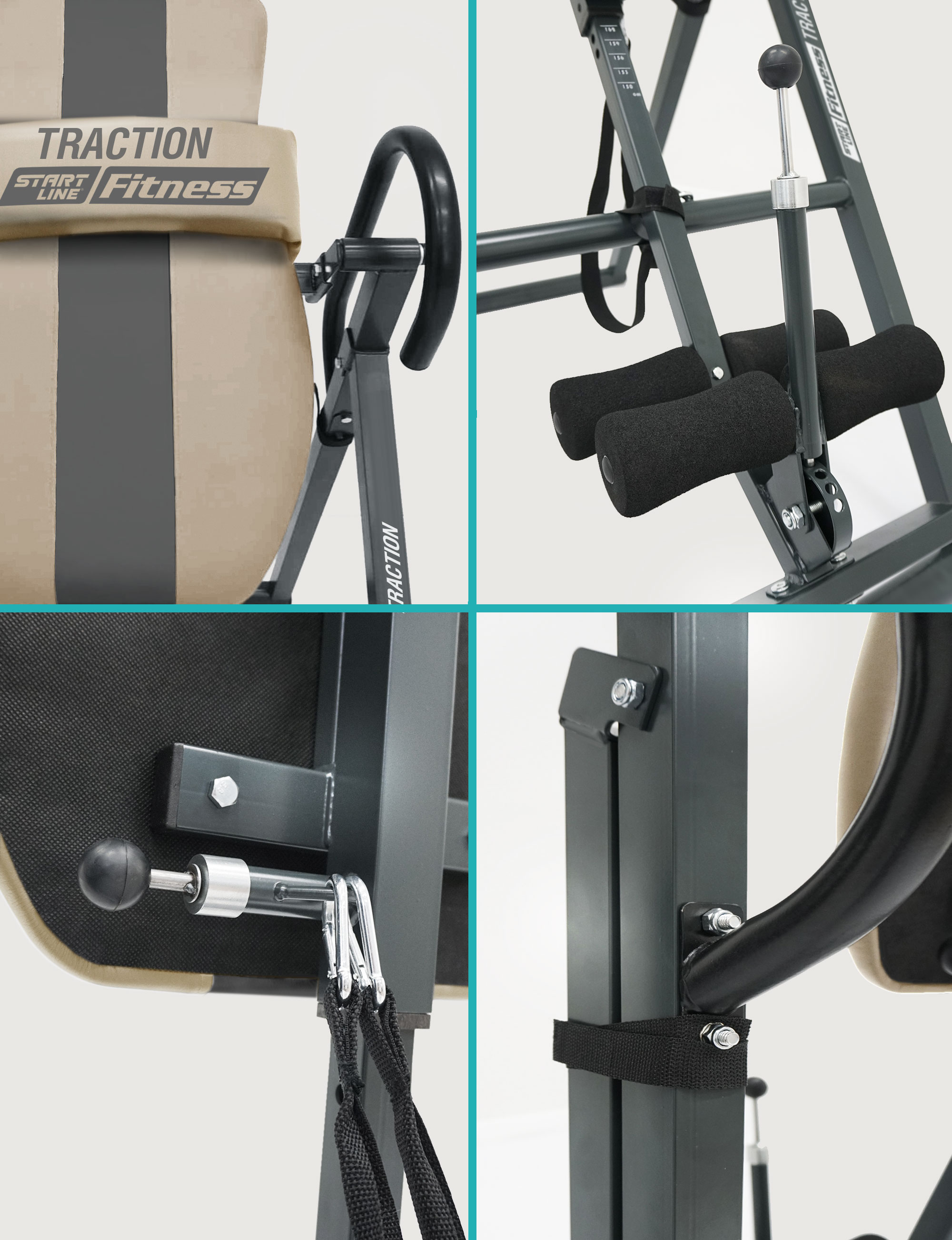 Заниматься инверсионной терапией на столе Traction могут как подростки, так и взрослые, ведь уровень роста регулируется от 150 до 197 см. Ограничение угла наклона осуществляется с помощью двух ремней, позволяющих выставить оптимальный угол для тренировки. При возврате в исходное положение энергоемкий амортизатор поглощает удар об опорную часть.