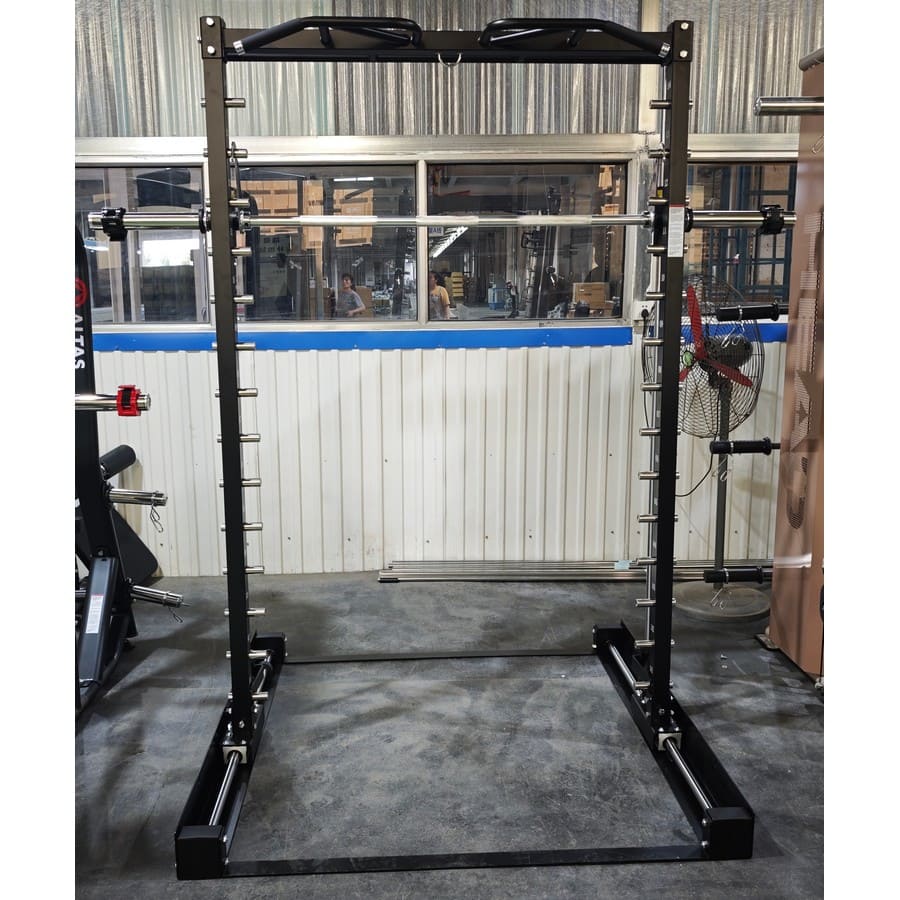 Все направляющие снабжены резиновыми отбойниками на концах труб. Для выполнения упражнений требующих ограничения движения по горизонтали в нижней части рамы предусмотрены стопоры, фиксирующие ход рамы в 3-х позициях. Все 14 позиций вертикальных держателей пронумерованы - для быстрого позиционирования при повторном подходе. Турник из прочной стальной трубы и рама из 3 мм стального профиля выдерживают нагрузку до 200 кг. Все стальные части рамы защищены от коррозии и случайных повреждений двумя слоями заводской краски, нанесенной методом электростатического напыления.