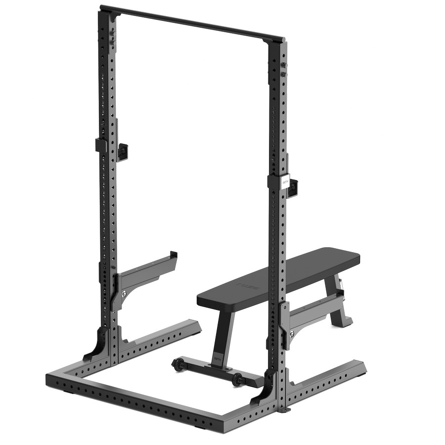 Силовой тренажер предназначен для выполнения упражнений со штангой на разные группы мышц. Рама оснащена j-крюками и страховочными упорами с более чем 65 позициями регулировки, поверхность держателей покрыты ПЭ материалом, который защищает штангу от повреждений. Регулировка вертикальной позиции производится с помощью штырей на держателях и перфорированных отверстий на раме. Наличие большого диапазона регулировок позволяют выполнять на тренажере (в том числе с использованием силовой скамьи) жим лежа, жим лежа под углом, жим сидя, приседания, тяги и прочие упражнения.