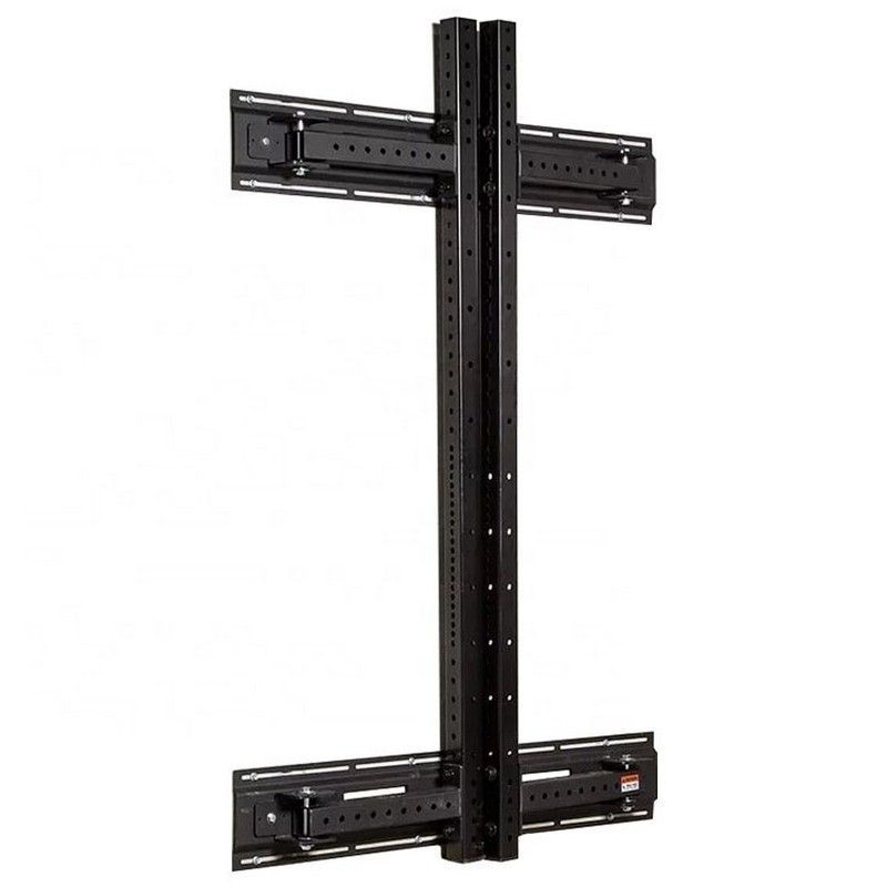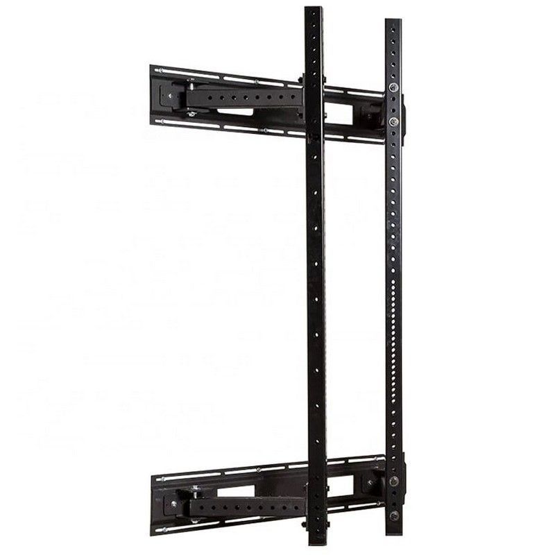 Для установки складной рамы для кроссфита необходимо прикрепить к стене специальные панели с поворотными шарнирами. Данные шарниры позволяют закрепить опорные стойки и складывать их к стене внутрь или наружу рамы. Стойки фиксируются в шарнирах при помощи специального фиксатора с дополнительной защитой от случайного «вылета» из отверстий – это дает двойную надежность соединению.