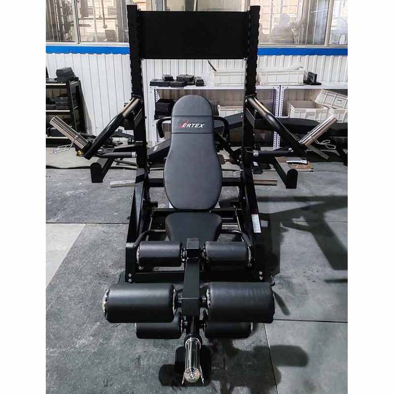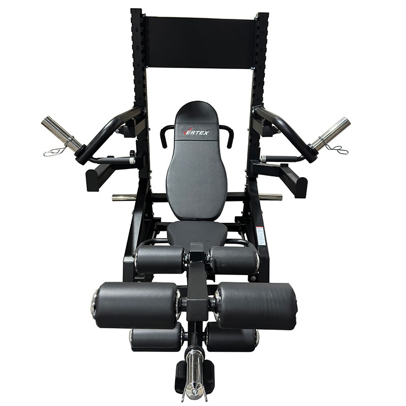 Использование: полупрофессиональное (в залах с ограниченным пространством, со средней интенсивностью использования) и домашнее.Профиль рамы тренажера: разборная конструкция из стального профиля - квадратный 60х60 мм и 50х50 мм, прямоугольный 50х70 мм (страховочные упоры), толщина стенки 2 мм.Цвет рамы: черный матовый.Покрытие рамы: двухслойное, порошковое, методом электростатического нанесения, с предварительной пескоструйной обработкой (с защитой от сколов и коррозии).Мягкие части тренажеры: обивка - 100% ПУ кожа, наполнитель вспененный материал, прошивка - двойная усиленной нитью.Эргономичная спинка и сиденье с контурной формой: наличие.Регулировка угла сиденья: 3 позиции на пружинном фиксаторе с винтовой затяжкой.Регулировка угла наклона спинки: 14 позиций - с положительным и отрицательным наклоном, на пружинном фиксаторе с винтовой затяжкой.Горизонтальная регулировка скамьи: 24 положения, на линейных подшипниках и стальных полированных направляющих, фиксируется стальными стержнями.Съемная часть для сгибания/разгибания ног: 1 шт., со стальным штырем для блокировки свободного хода.Валики для ног: 6 шт., с торцевыми колпачками из ABS-пластика.Съемные рычаги для жима руками: 2 шт., на промышленных подшипниках и стальных втулках, с 2 резиновыми отбойниками, смена позиции на пружинных фиксаторах с винтовой затяжкой.Съемные страховочные плинты: 2 шт., смена позиции на пружинных фиксаторах с винтовой затяжкой.Изменяемая ширина страховочных плинтов: 490 мм и 1260 мм (под короткий или длинный гриф).Кол-во позиций для плинтов и рычагов: 10 шт., пронумерованы методом лазерной резки.Длина втулок нагружения на рычагах и на станции для ног: 205 мм.Адаптеры для хранения дисков: 2 шт., длина 205 мм.Крюки для хранения съемных аксессуаров: 4 шт., стальные.Конструкция: разборная, на болтовых соединения с самостопорными гайками.Складная конструкция: с вертикальным хранением скамьи и подвесными аксессуарами.Вес: 120 кг.Вес в упаковке: 145 кг.Размер в собранном виде (ДхШхВ): 213х143х155 см.Размер в упаковке: 256х66х38,5 см.Объем: 0,65 куб.м.- Бренд VERTEX