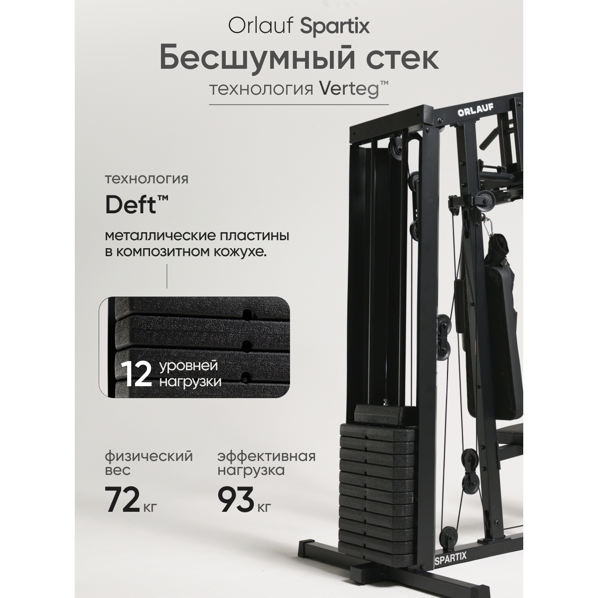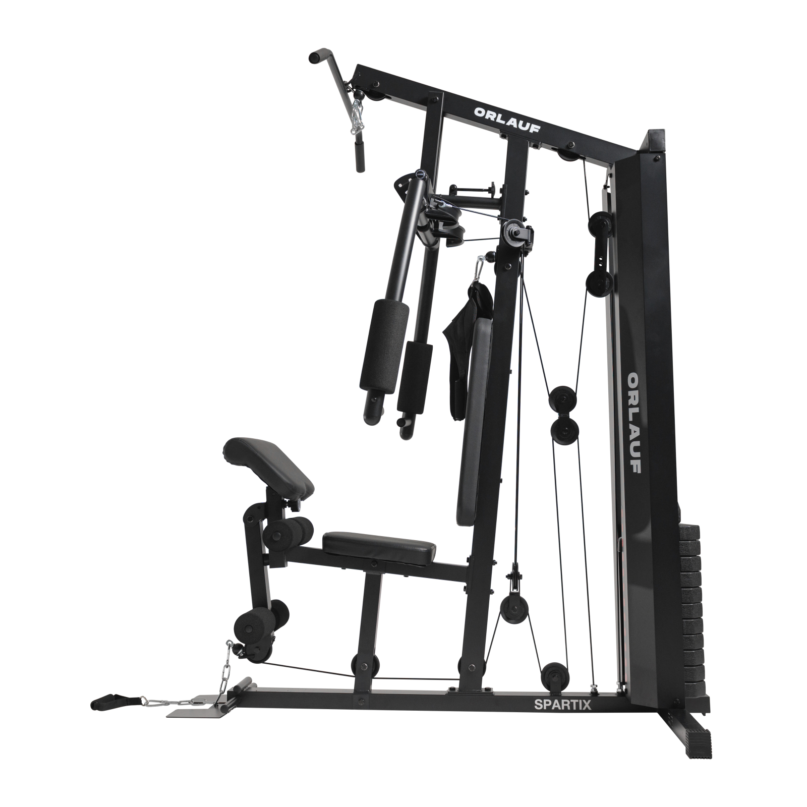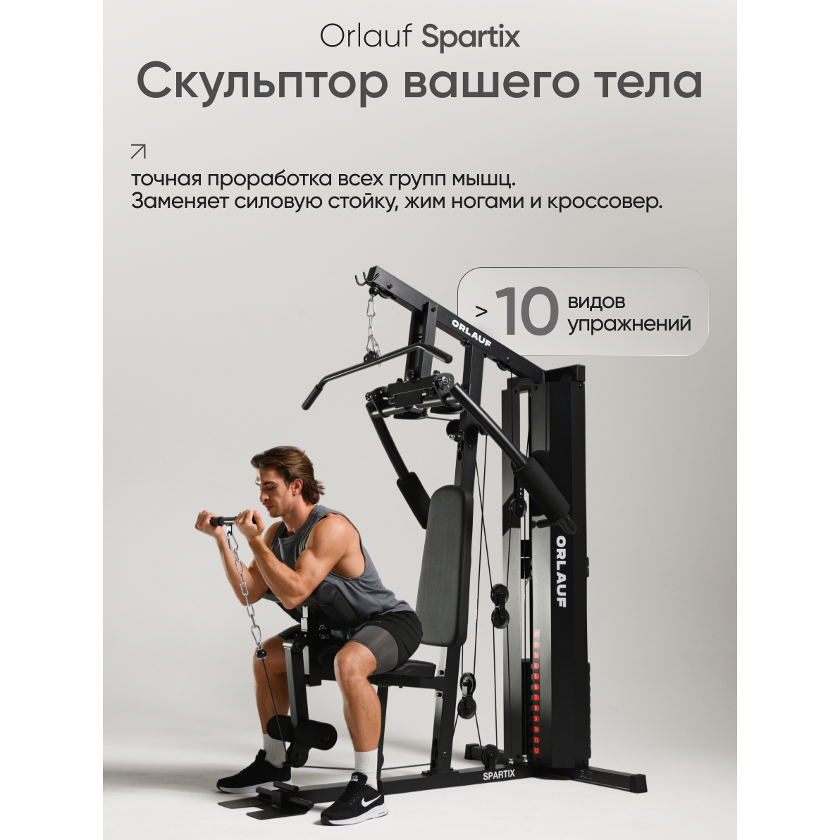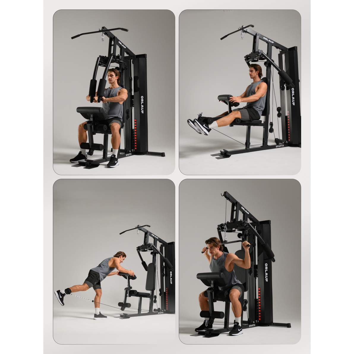 Orlauf Spartix — это профессиональный многофункциональный тренировочный комплекс для дома, который заменяет целый фитнес-зал. Модель оснащена усиленной рамой из особо прочного металла с двойной порошковой окраской, обеспечивающей максимальную устойчивость и защиту от коррозии. Конструкция на пяти опорах и антискользящие накладки гарантируют непоколебимую стабильность даже во время самых интенсивных тренировок.