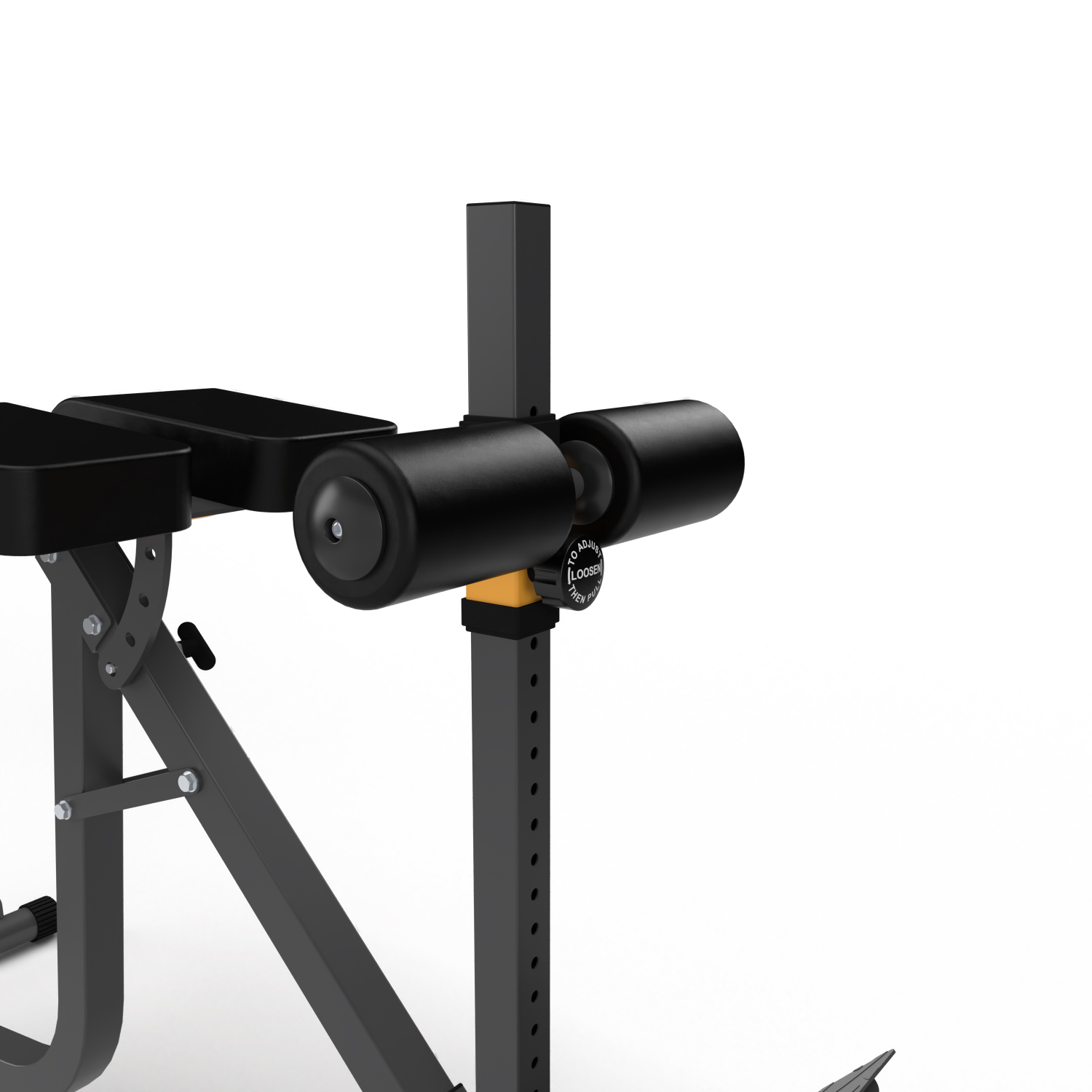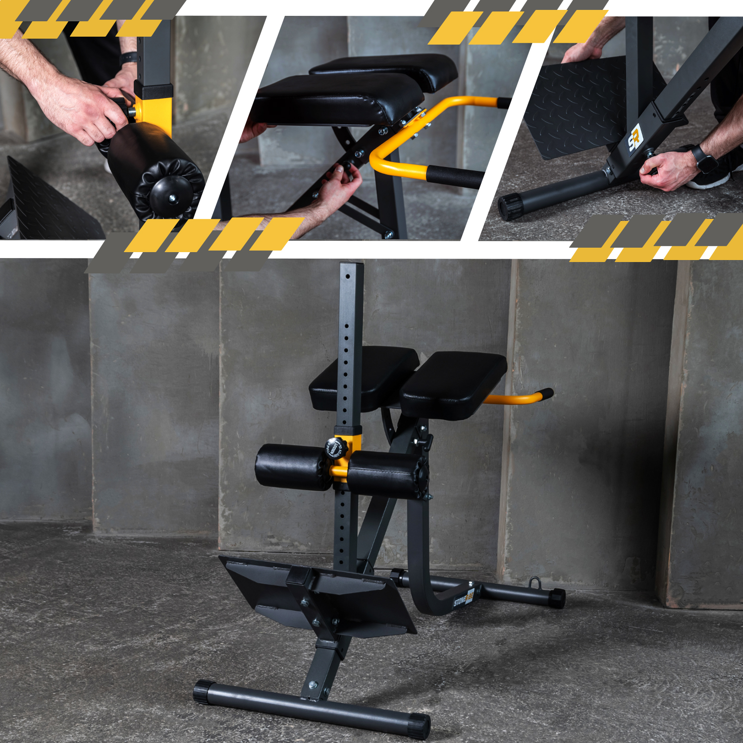 Угол наклона подушек регулируется в 4-х положениях: 4,5°, 18°, 31,5° и 45°. Данное свойство позволяет выполнять несколько техник гиперэкстензий, в том числе обратную и с наклоном. Подушки для упора, размерами 35 х 19 х 7 см выдерживают динамическую нагрузку до 150 кг.