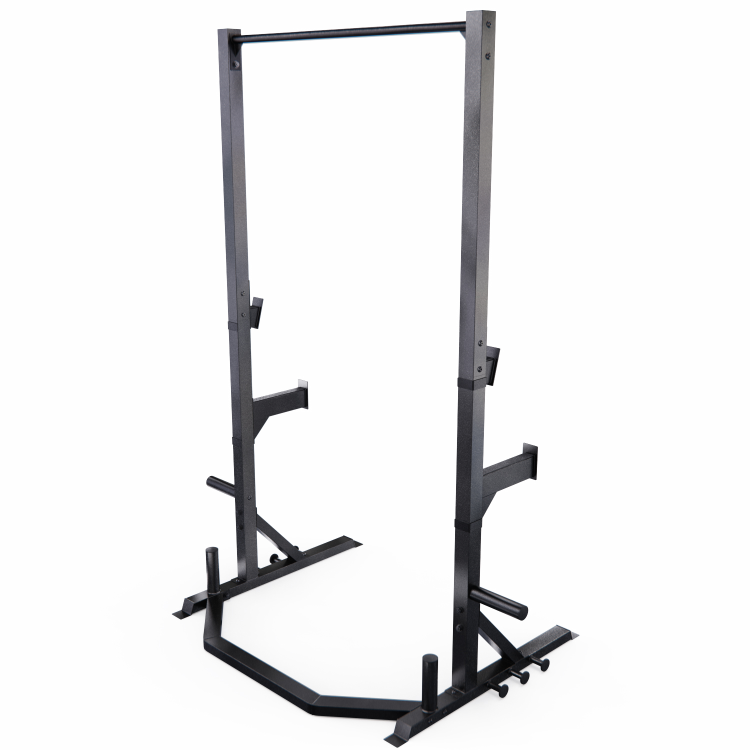 Высота стойки 216 см. Регулируемые на 18 уровней держатели для штанги и страховочные держатели помогут настроить тренажер под собственный рост, что делает ее идеальным выбором для пользователей разной комплекции. 2 посадочные втулок для хранения дисков диаметром 50 мм и 2 втулки для грифов 60 мм обеспечивают удобное хранение веса и позволяют быстро подготовиться к тренировке.