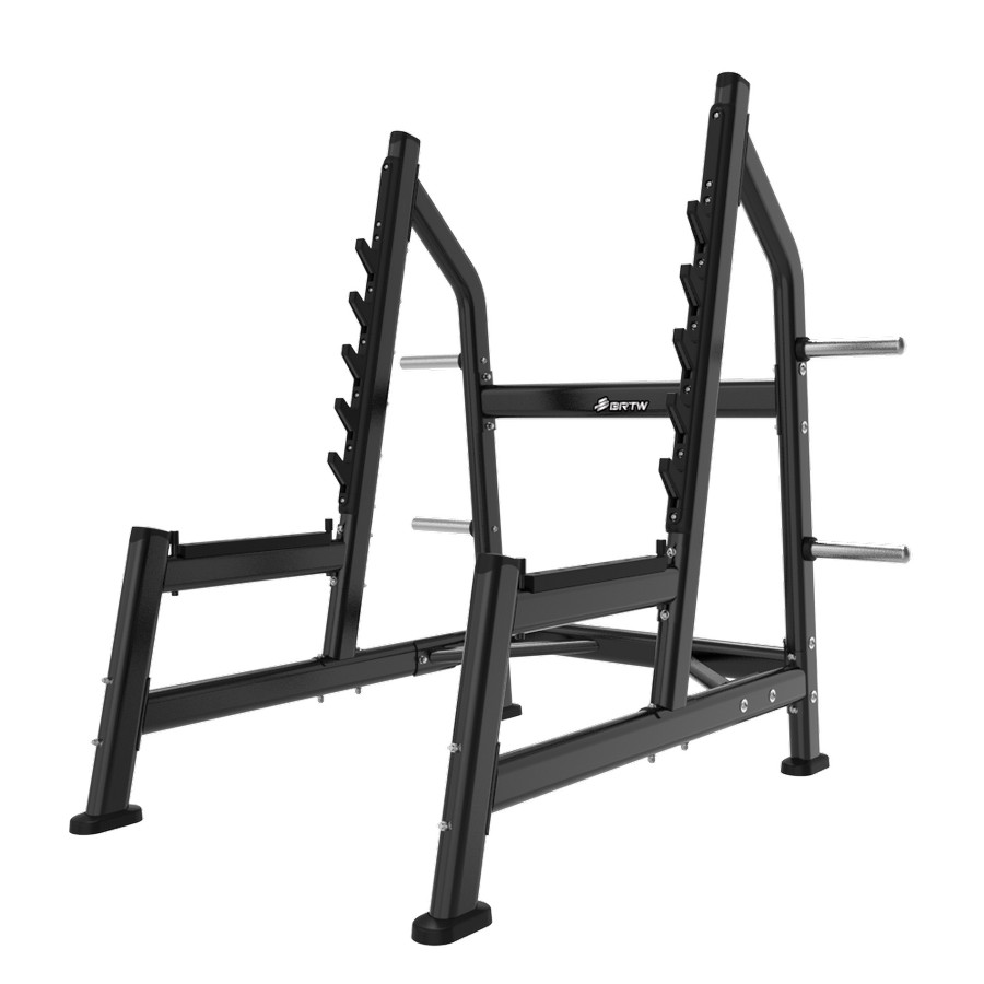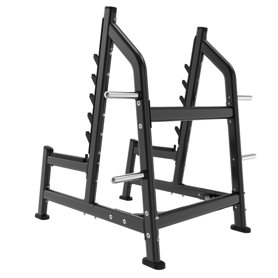 Олимпийские диски для тренировки всегда "под рукой", благодаря встроенным 4 держателям для хранения необходимого комплекта блинов на тренажере. Стойка имеет широкий устойчивый дизайн и толстые резиновые накладки на ножках, которые амортизируют удары и защищают напольное покрытие. Благодаря использованию толстостенного 3,5 мм стального профиля рама тренажера способна выдержать нагрузки до 400 кг. Все стальные поверхности защищены от сколов и коррозии двойным слоем краски, нанесенной методом электростатического напыления.