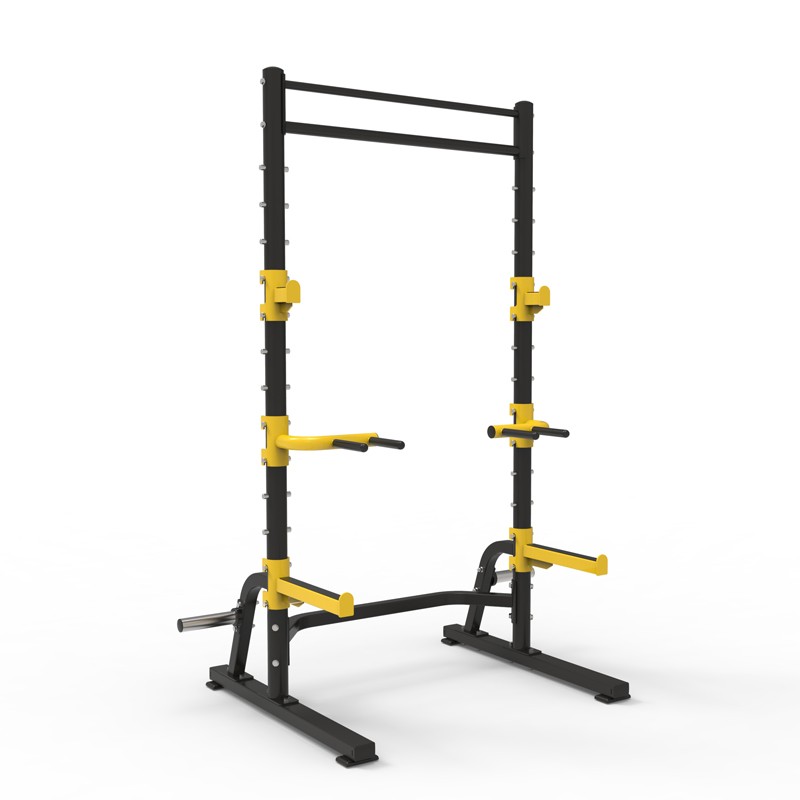 Силовая полурама Insight Fitness TS104 сочетает в себе стойку для приседаний, брусья с двумя хватами, страховочные плинты и крюки для штанги, которые регулируются по высоте в 12 позициях. Подходит для полупрофессионального использования.