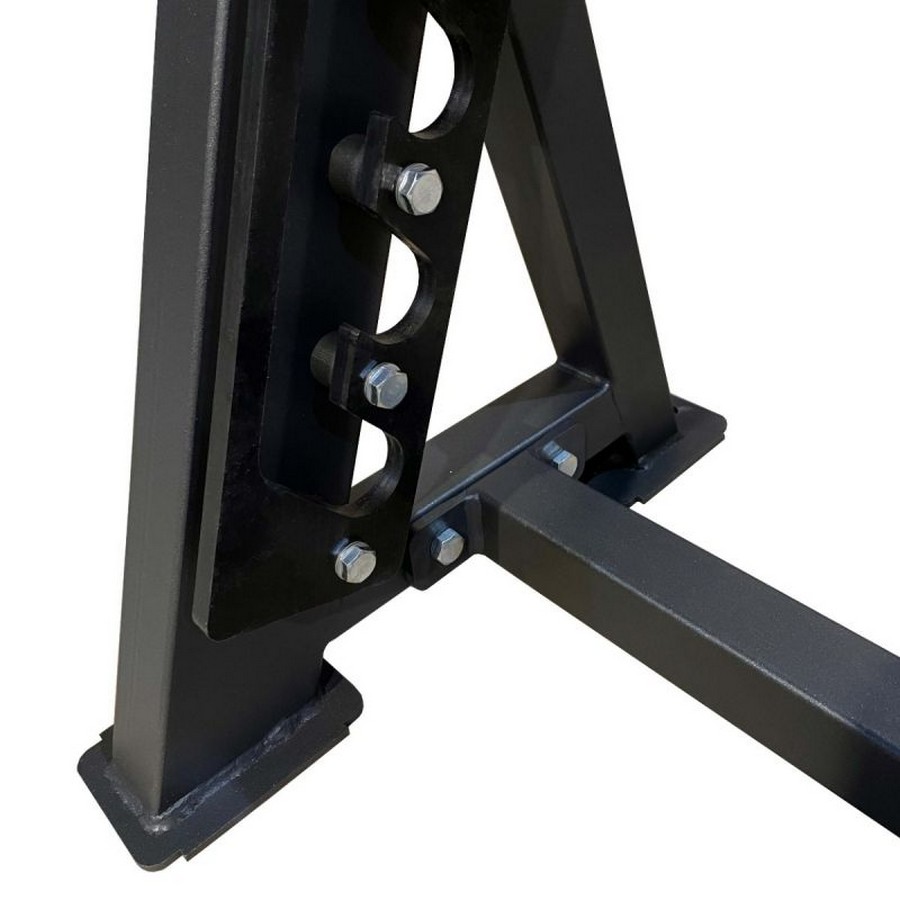 Конструкция сделана из 3 мм прочной стали и покрыта двумя слоями антикоррозиной краски. Небольшой вес стойки позволяет комфортно перемещать её в любое место спортивного зала. Рама имеет Л-образные ножки с резиновыми подпятниками, что обеспечивает устойчивость при выполнении упражнений. Тренажер поставляется в разобранном виде в надежной транспортной упаковке, при сборке скрепляется болтами и гайками с самостопорным механизмом, который препятствует произвольному развинчиванию.