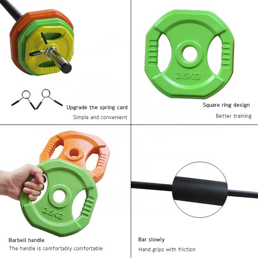 Каждый диск имеет свой яркий цвет - зеленые по 1,25 кг, оранжевые по 2,5 кг и желтые по 5 кг. Диски имеют шестигранную форму, что предотвращает откат штанги и позволяет комфортно ставить штангу после выполнения упражнений.