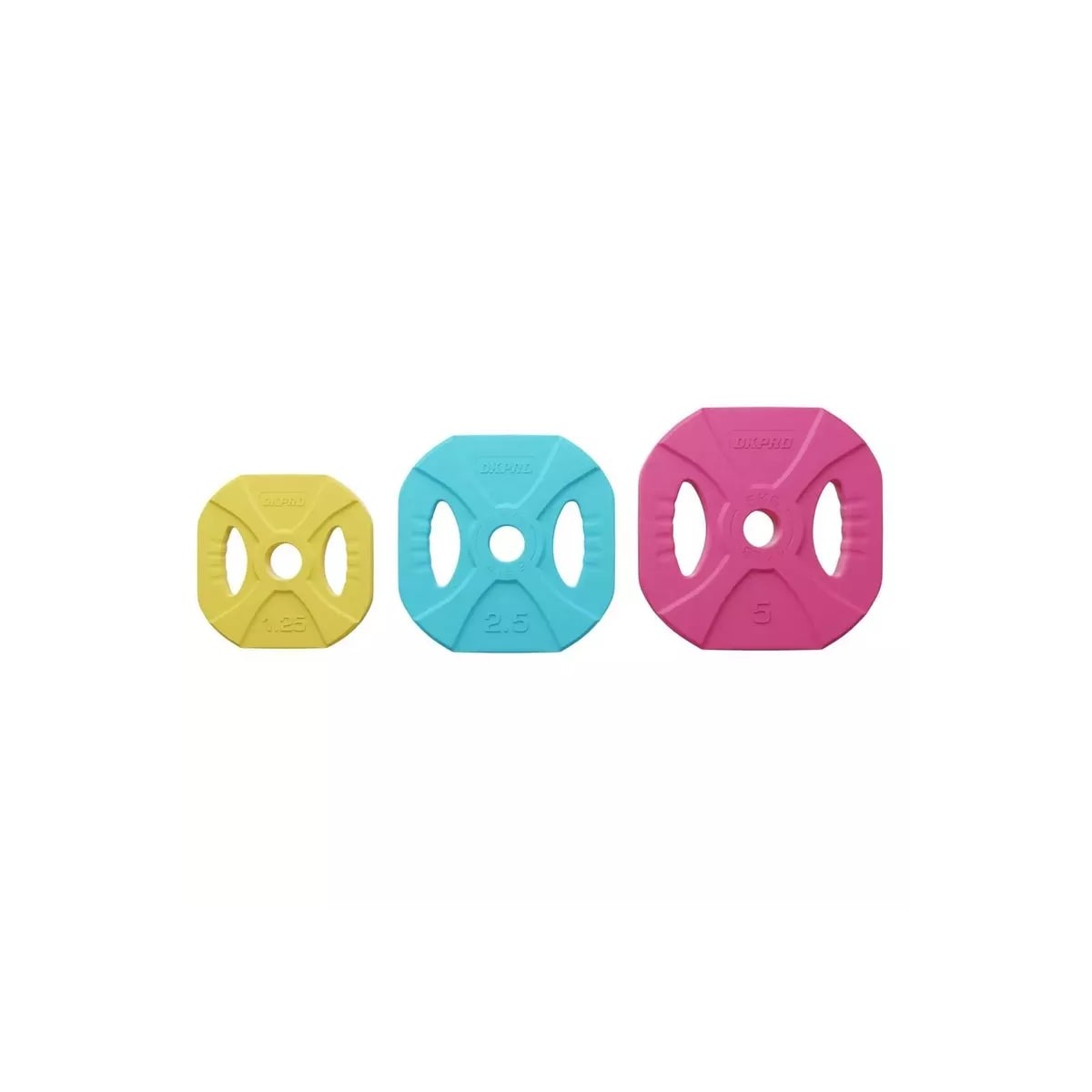 1.25 кг х 2шт.; 2.5 кг х 2 шт.; ,5 кг х 2 шт; штанга - 1 шт.