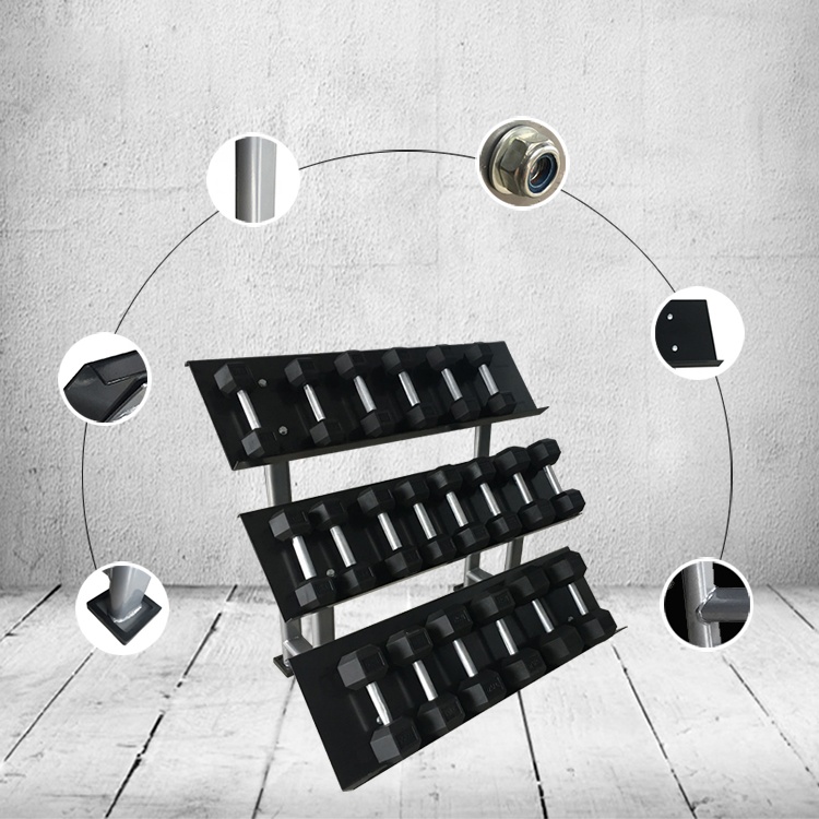 Горизонтальная трехъярусная стойка для хранения гантелей. Подходит для хранения гексагональных гантелей малых и больших весов (10-15 пар).