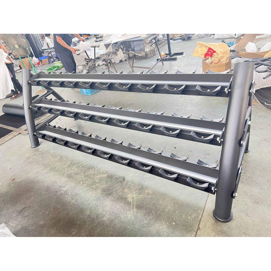Горизонтальная трехъярусная стойка для хранения гантелей OKPRO OK0016B подходит для хранения гексагональных гантелей малых и больших весов (10-15 пар, от 2,5 до 60 кг). Мощная конструкция на двух треугольных опорах из круглой трубы с надежными полками из 4 мм стали.