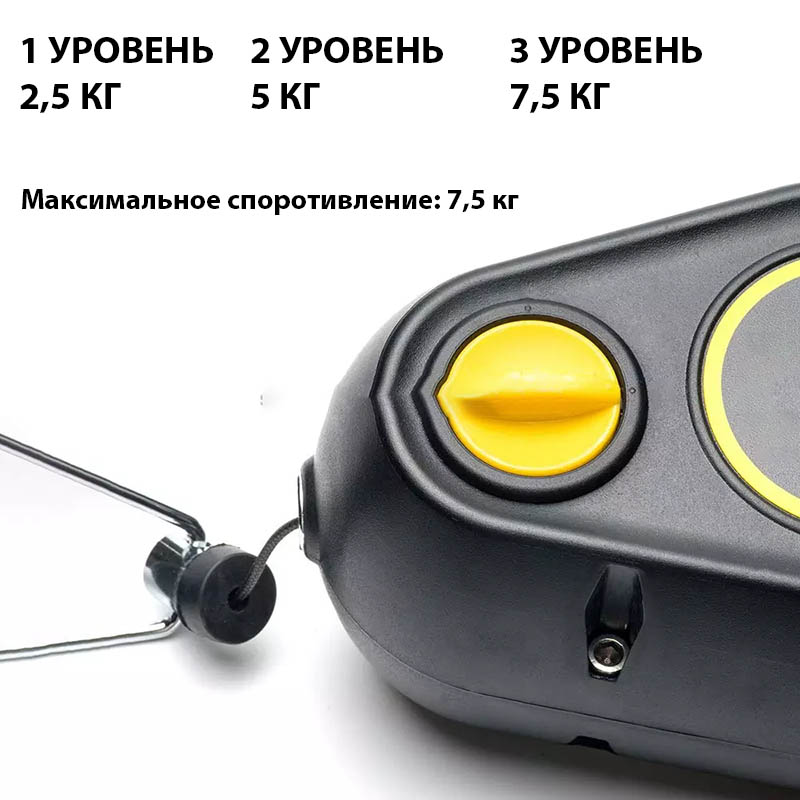 Нагрузка тренажера регулируется крутящейся желтой рукояткой на корпусе. 3 режима сопротивления - 2,5 кг, 5 кг и максимальные 7 кг. Спектр упражнений, которые можно выполнять с помощью канатного тренажера очень широк. Вот лишь некоторые из них: