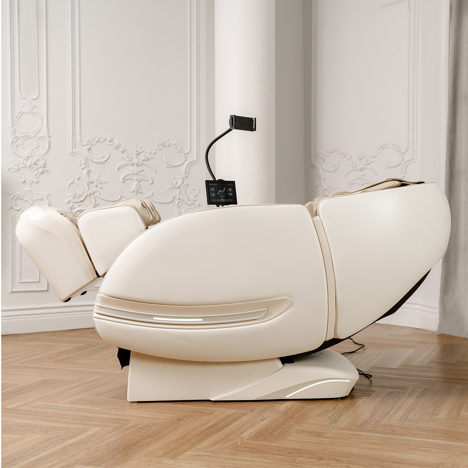 Функция Zero-G с двумя положениями невесомости оптимально распределяет вес тела и усиливает эффект массажа. Система Smart-Slide позволяет размещать кресло всего в 18 сантиметрах от стены. Встроенный биосенсор анализирует показатели организма и корректирует параметры работы. Управление осуществляется через интуитивно понятный планшет и кнопки быстрого доступа. Для комфортного использования смартфона во время сеанса предусмотрена специальная кнопка пролистывания ленты социальных сетей в области пальцев. В подлокотник встроена беспроводная зарядка для смартфона и подвижная подставка для гаджетов. Встроенные Bluetooth-колонки позволяют наслаждаться любимой музыкой во время сеанса массажа.