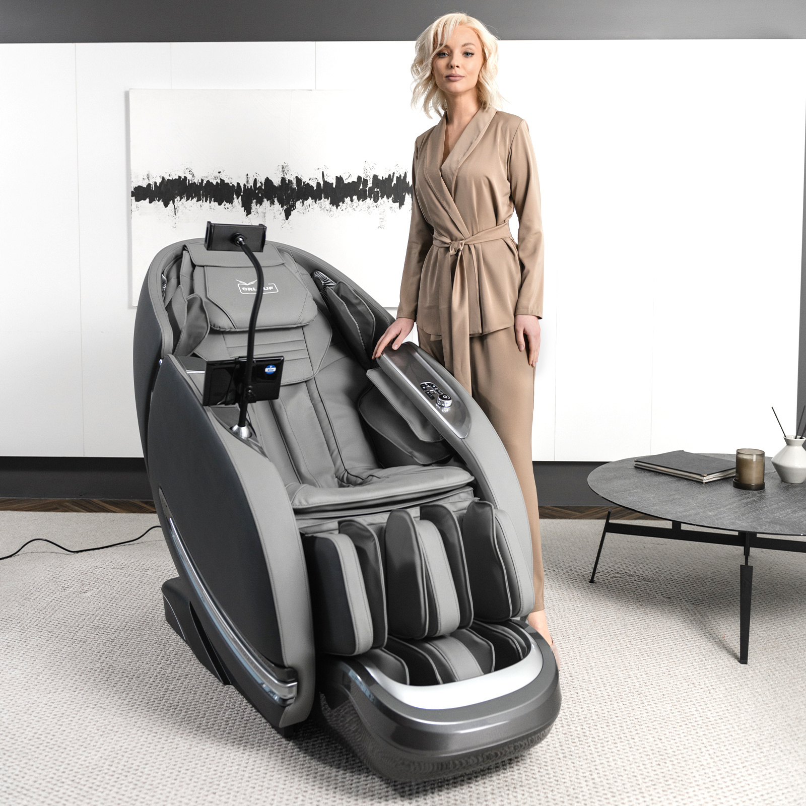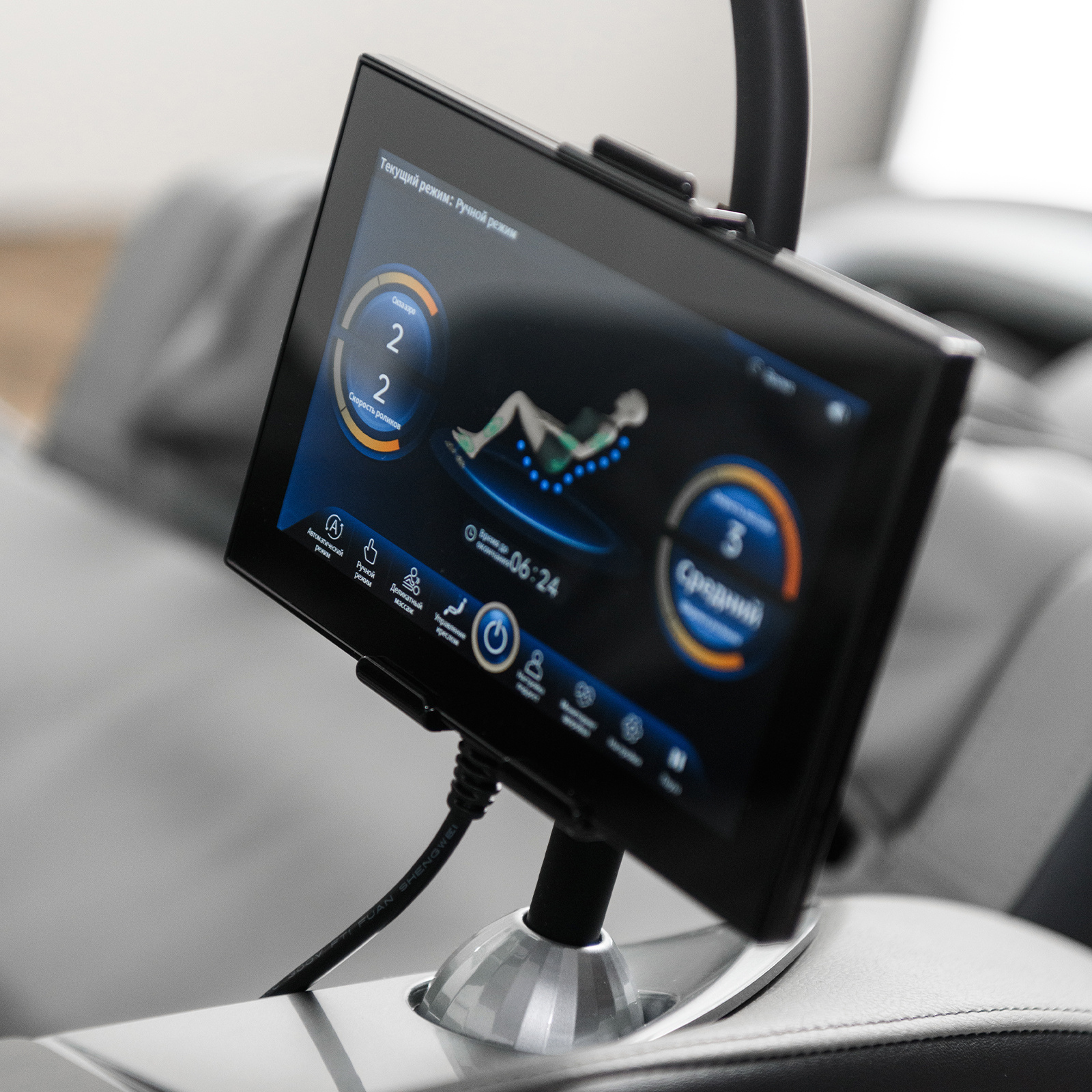 Управление осуществляется через интуитивно понятный планшет и кнопки быстрого доступа. Для комфортного использования смартфона во время сеанса предусмотрена специальная кнопка для пролистывания лент соцсетей EasySlide™, расположенная в зоне для пальцев. В подлокотник встроены беспроводная зарядка для смартфона и подвижная подставка для гаджетов. Встроенные Bluetooth-колонки позволяют наслаждаться любимой музыкой во время сеанса массажа.