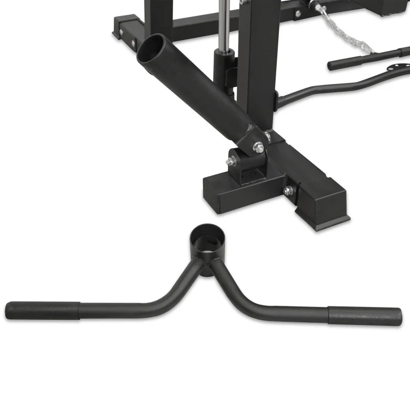 - Дополнительно Гриф - 197 см, ф50, 14 кг, 9 уровней регулировки по высоте, стакан для хранения грифа, 4 пружинных замка для грифа. Силовая рама. Машина Смита. Многопозиционный турник. Многопозиционные брусья. Двойная тяга. Гребная тяга. Шарнирный крепеж грифа.