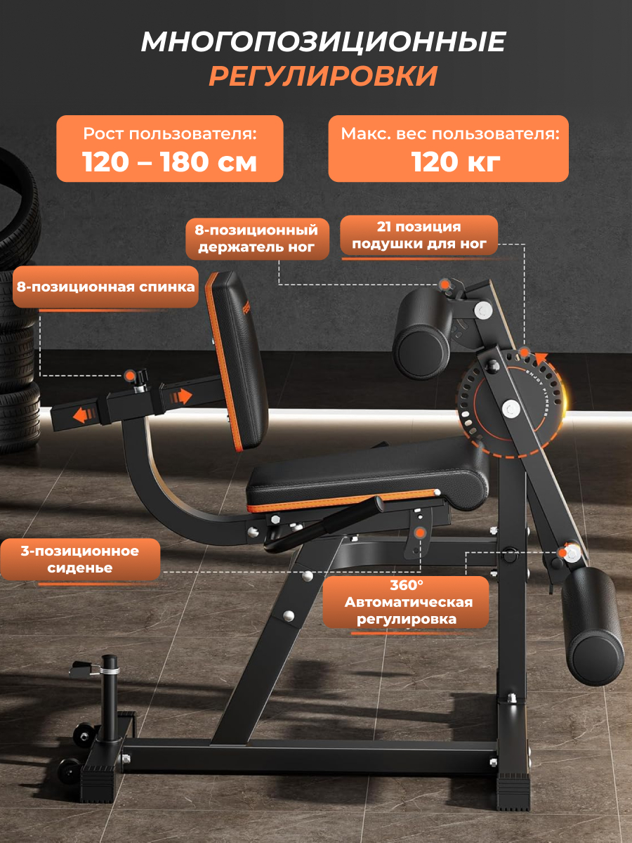 Максимальный вес пользователя составляет до 120 кг, что обеспечивает безопасную и комфортную эксплуатацию тренажёра для людей разного уровня подготовки. Спинка регулируется в 8 положениях, а сиденье — в 3 режимах. Индивидуальная настройка тренажера обеспечивает максимальный комфорт и эффективность. Большой диск для регулировки угла наклона руки и ноги имеет 21 уровень, а меньший диск на 8 уровней.