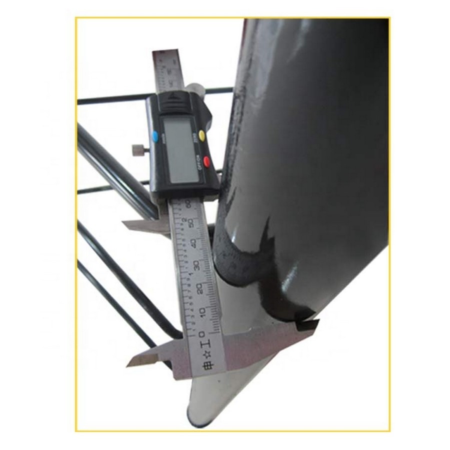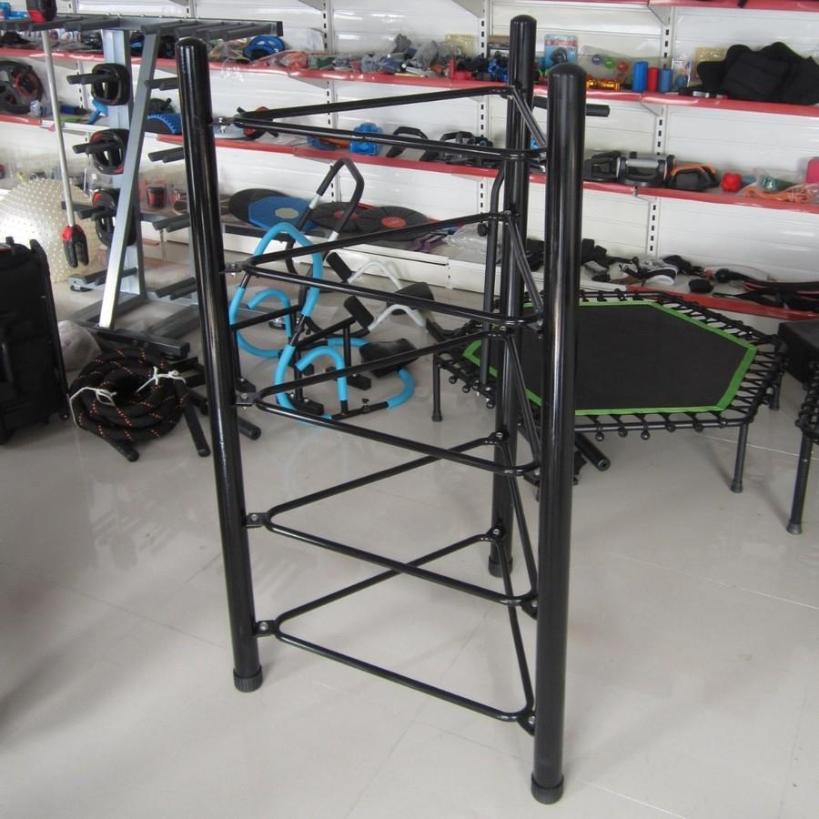 Рама стойки сделана из стального профиля круглого сечения диаметром 50 мм и толщиной металла 1,5 мм. Полки выполнены из круглого профиля с с диаметром 20 мм и толщиной стенки 1,5 мм. Треугольная форма стойки позволяет компактно разместить ее в углу зала. Поверхность стойки защищена от сколов, царапин и коррозии двухслойным порошковым покрытием с электростатическим нанесением.