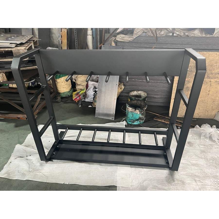 Стойка для хранения бодибаров. Вместимость стойки зависит от размера и веса инвентаря. Сделана из крепкого стального профиля 30х60 мм с толщиной стенки 1,5 мм из стали Q235. Рама покрыта двухслойным антикоррозийным покрытием с предварительной обработкой метала. Состоит из 8-ми отсеков для вертикального хранения бодибаров разных весов.