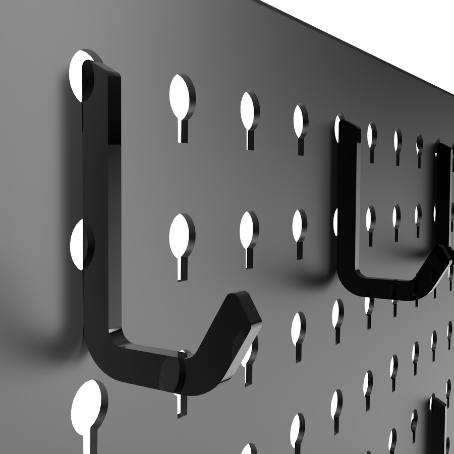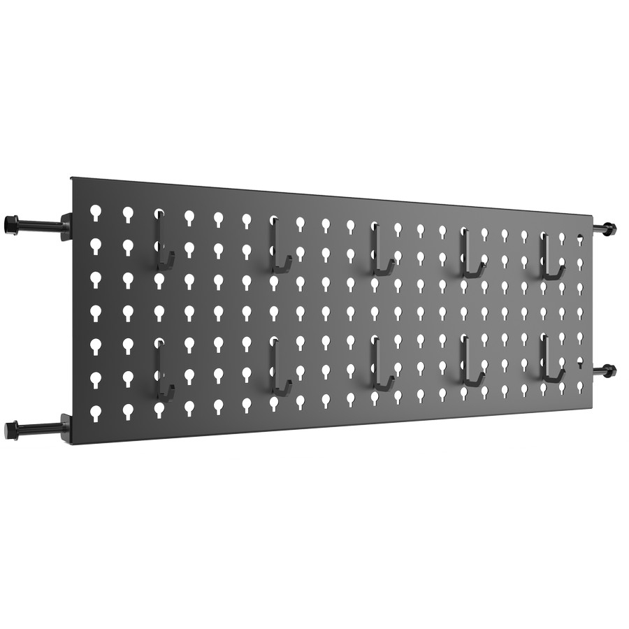 Угловой компактный дизайн с пристенным креплением стойки позволяет сэкономить пространство спортивного зала и поместить много спортинвентаря на маленькой площади. В верхних частях рамы расположено два перфорированных стальных щита с отверстиями и крюками для хранения блочных ручек. В комплекте по 10 крюков на каждую сторону, крепление можно переставить в любую удобную позицию, воткнув крюк в люое отверстие на листе.