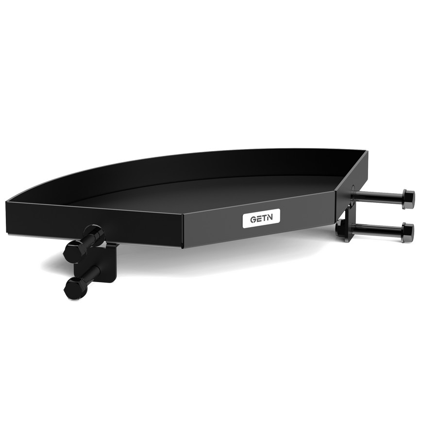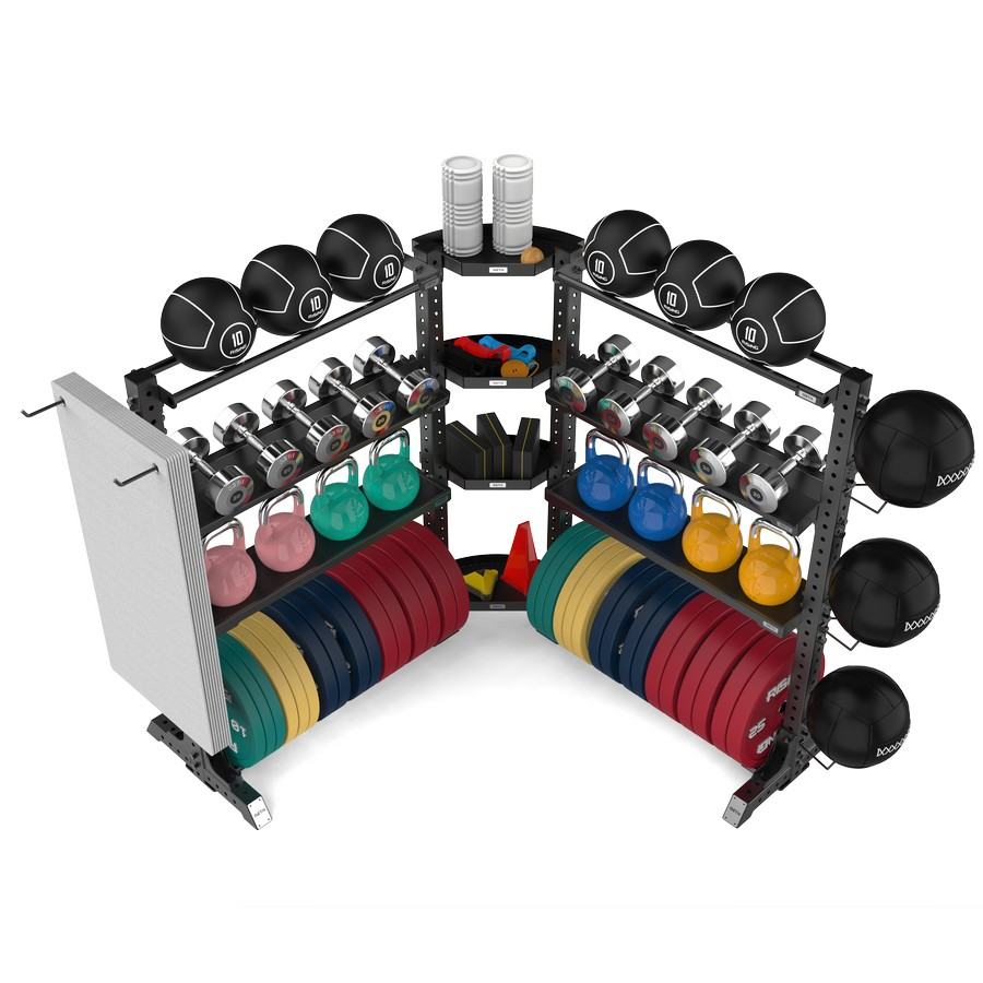 Еще ниже расположены прочные горизонтальные полки для гирь на которых также можно хранить тренировочные сумки и прочий тяжелый инвентарь. Самые нижние полки в виде параллельных штанг служат для хранения олимпийских дисков разного веса и диаметра. Ширина горизонтальных полок 108 см. 4 угловые полки можно использовать для хранения таких аксессуаров, как: тренировочные канаты, конусы, массажные мячики, ручные эспандеры, массажные ролики и др. На торцах стойки размещены - крюки для вертикального хранения ковриков с одной стороны и 3 одинарных круглых полки для хранения мячей.
