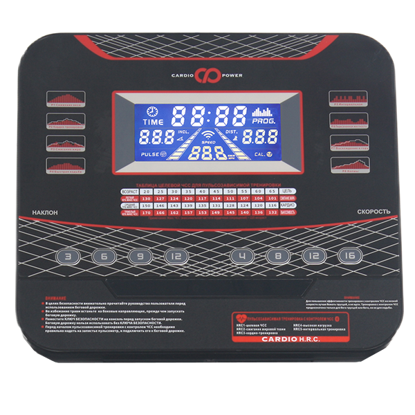 - Показания консоли скорость / расстояние / время / наклон / частота пульса / калории / программы