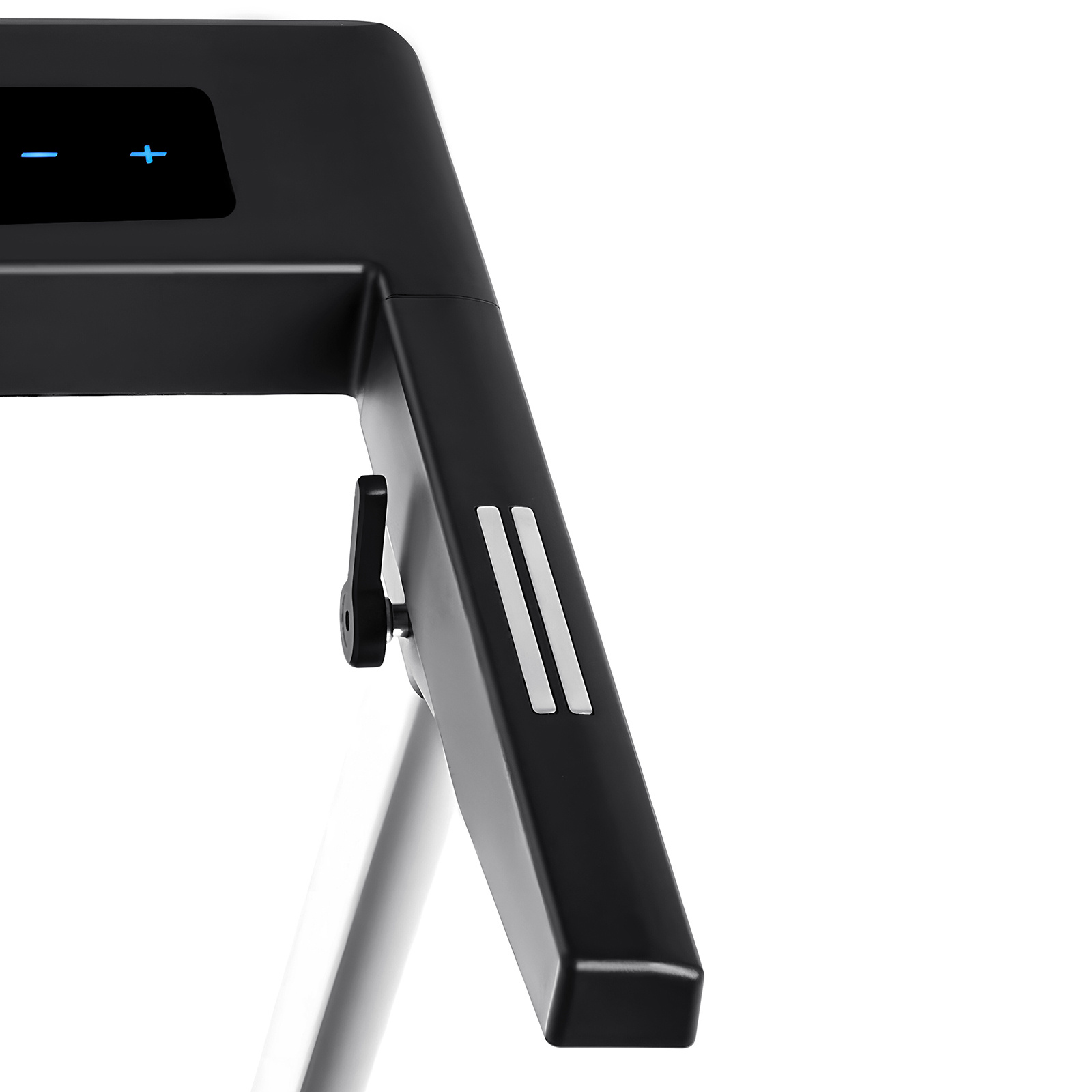 Многослойное беговое полотно SchrittBind размером 130 х 48 см с антискользящим покрытием гарантирует удобство и свободу движений, подходя пользователям ростом до 200 см. Система амортизации Softlauf с 8 эластомерами и двумя прорезиненными опорами нагрузку на суставы, а прорезиненные опоры защищают напольное покрытие.