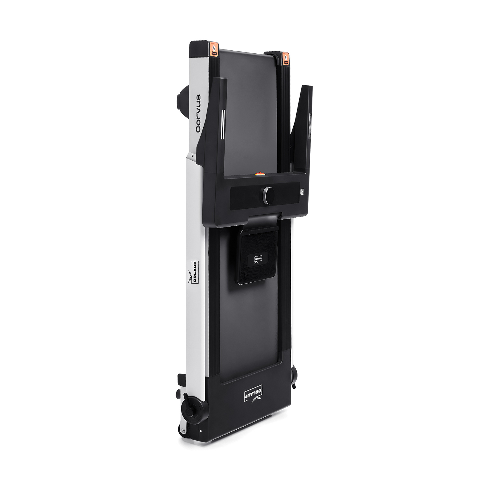 Беговая дорожка Orlauf Corvus — функциональное решение для домашних тренировок, которое легко впишется в любой интерьер. Компактное складывание до толщины 25 см позволяет хранить дорожку вертикально или горизонтально, экономя пространство. Это удобный выбор для тех, кто ценит компактность и эффективность тренажера в условиях ограниченной площади.