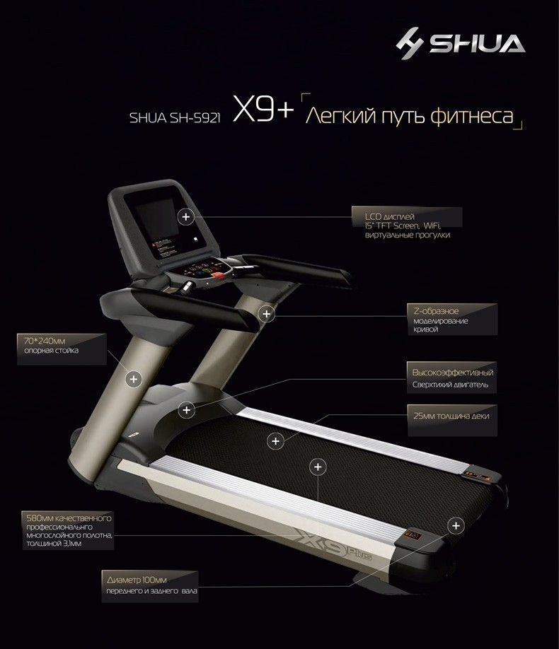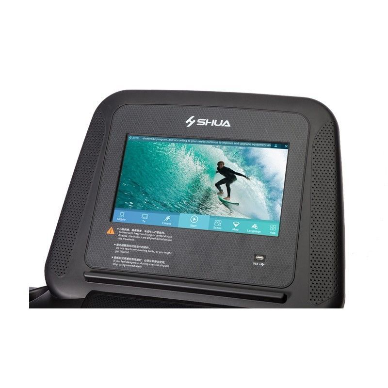 Консоль дорожки с 15,6 дюймовым тачскрином позволяет проводить тренировки с виртуальными пейзажами, воссоздающими естественные видеоландшафты на экране. Также на дисплее отображаются: калории, пульс, время, расстояние, скорость и информация о текущей программе. Для удобства спортсменов консоль оснащена кнопками быстрого доступа для изменения скорости, угла наклона и выбора встроенных программ. Тренировка на дорожке комфортна, благодаря современной амортизационной системе SUT, предотвращающей травмы коленей и суставов. Безопасность дорожки Х9 SH-5921 обеспечивается кнопкой аварийной остановки и двумя уровнями защиты двигателя - от перегрева и от пиковой перегрузки. Это позволяет использовать дорожку в режиме non-stop в спортзалах и фитнес-клубах.Конструкция SHUA Х9+ SH-T5921 говорит о том, что перед нами серьезный тренажер премиум-класса: