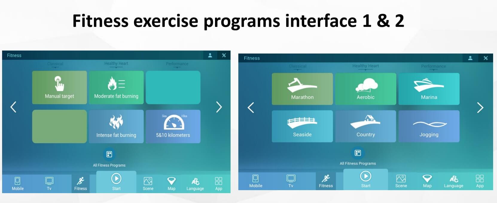 - Профессиональные спортивные программы: марафон, щадящее сжигание калорий, сильное сжигание калорий, 5 и 10 км, кардиопрограмма, yacht marina, берег моря и песчаная дорога, сельская местность и бег по холмам.