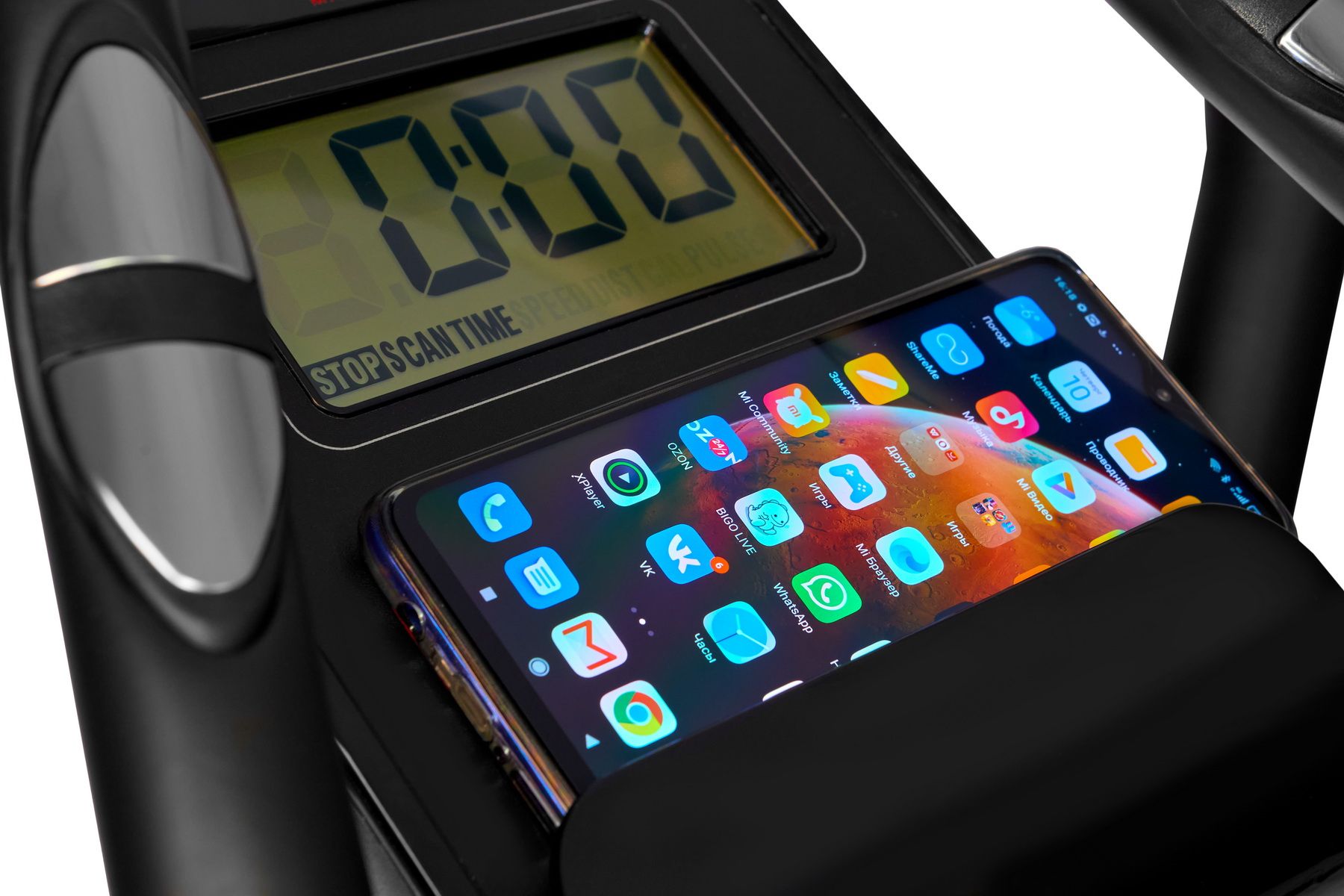 - Показания консоли время, дистанция, скорость, калории, обороты в мин., пульс