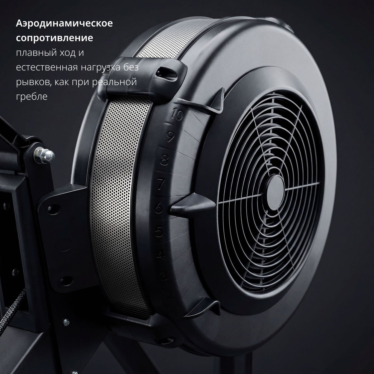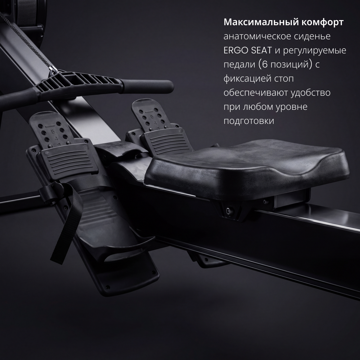 Ключевые преимущества:Гармоничная проработка всех групп мышц – тренажер задействует ноги, руки, спину, грудь и пресс, обеспечивая полноценную тренировку. Укрепление сердца и дыхательной системы – интенсивные кардионагрузки улучшают выносливость и общее состояние организма. Аэродинамическое сопротивление – плавный ход и естественная нагрузка без рывков, как при реальной гребле. Максимальный комфорт – анатомическое сиденье ERGO SEAT и регулируемые педали (6 позиций) с фиксацией стоп обеспечивают удобство при любом уровне подготовки. Умный контроль тренировки – многофункциональный дисплей 4.0″ отображает: