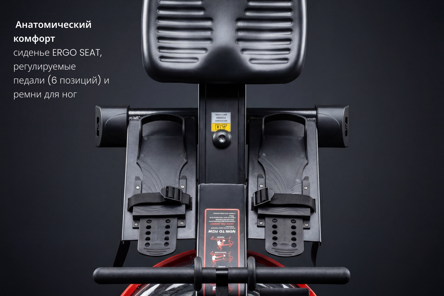 Ключевые преимущества:Водное сопротивление – 5 уровней нагрузки для тренировок от новичка до профессионала. Профессиональная конструкция – стальная рама и анодированный алюминий выдерживают до 160 кг. Анатомический комфорт – сиденье ERGO SEAT, регулируемые педали (6 позиций) и ремни для ног. Многофункциональный дисплей – отслеживайте скорость, время, дистанцию, калории и общий прогресс. Компактность и мобильность – транспортировочные ролики и удобное хранение. Долговечность и надежность – нейлоновый ремень, двухсекционный бак и профессиональный уровень использования.