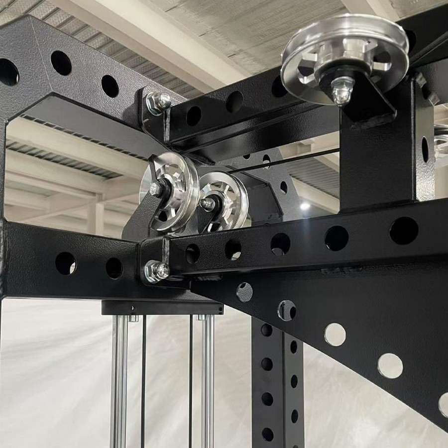Тросовый блок тренажера состоит из долговечных алюминиевых шкивов с впресованными малошумными подшипниками, стального 5 мм троса в ПУ оплетке, идеально ровных направляющих стеков из стали с зеркальной полировкой и втулок плиток стека с низким коэффициентом трения.