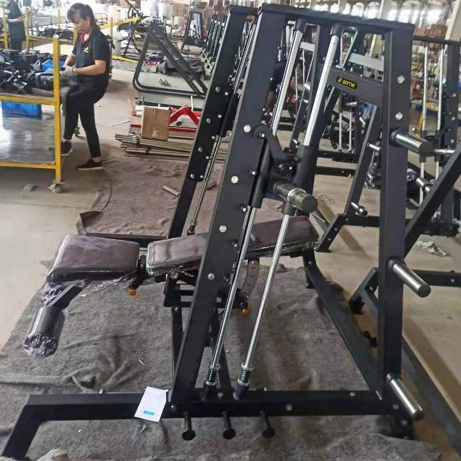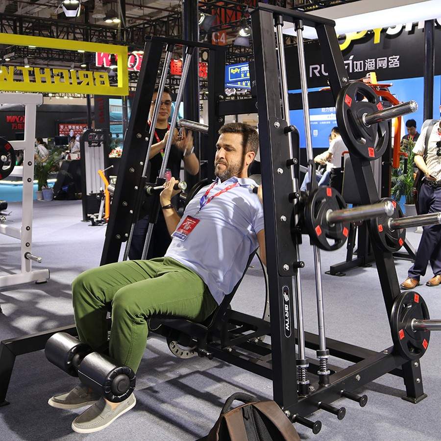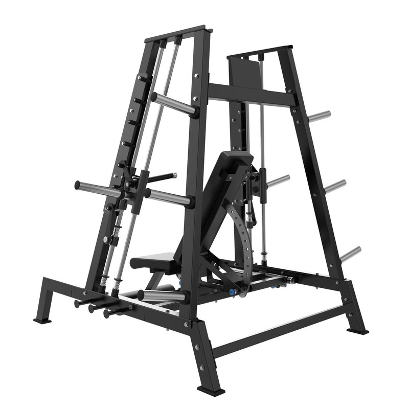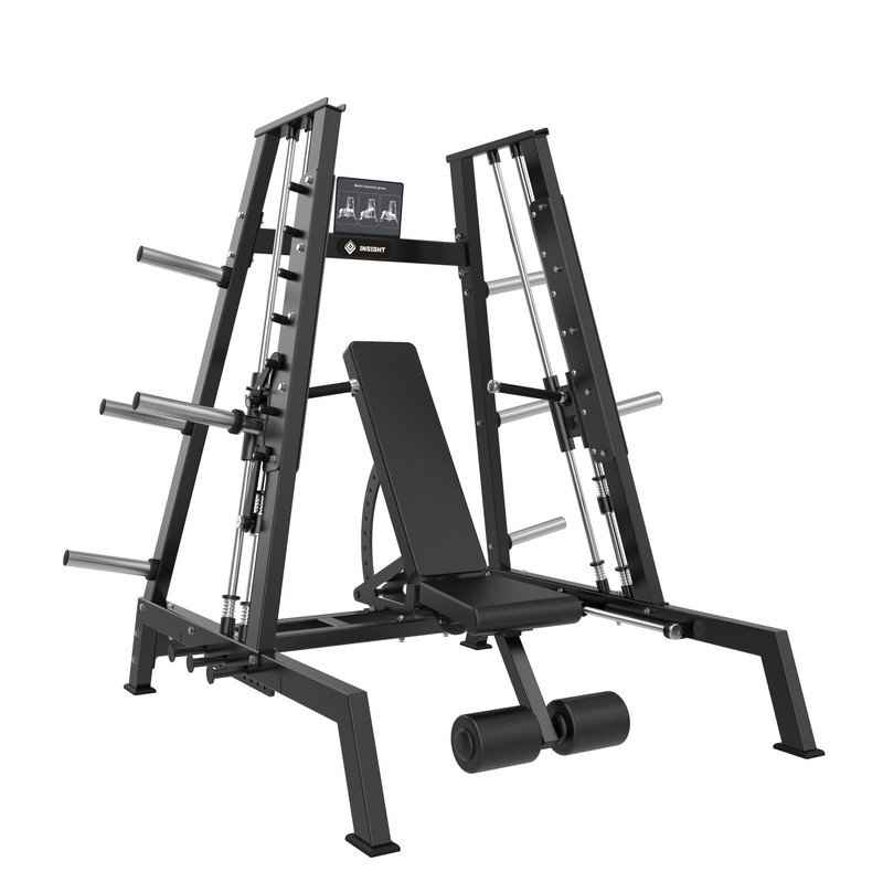 Профессиональный комплексный тренажер для жима сидя/лежа под разными углами. По конструкции представляет собой машину Смита, но только не для приседов, а специализированно для жимов. Конструкция аналогична Смиту - направляющие с рычагами, нагружаемыми олимпийскими дисками, страховочные крюки и страховочные пружинные амортизаторы. Количество уровней страховочных упоров - 5, каждый упор покрыт ударопрочным ABS-пластиком.