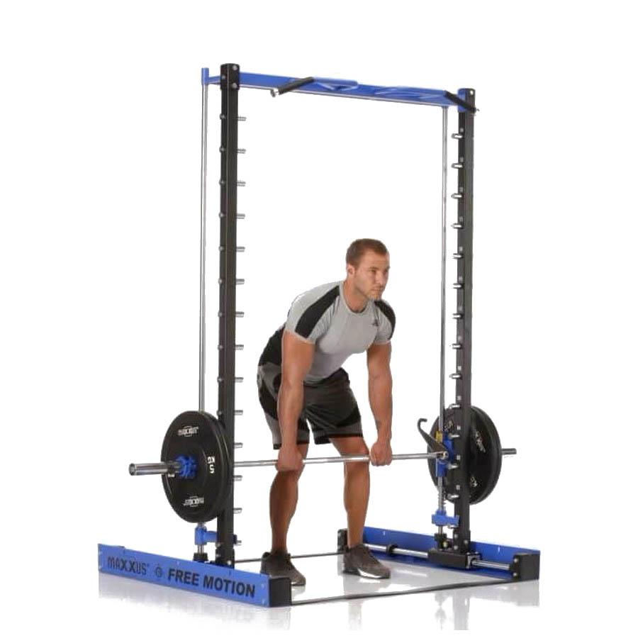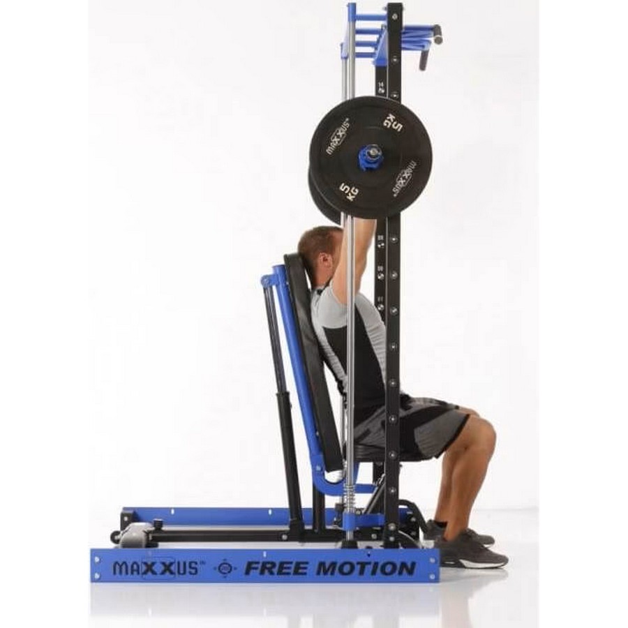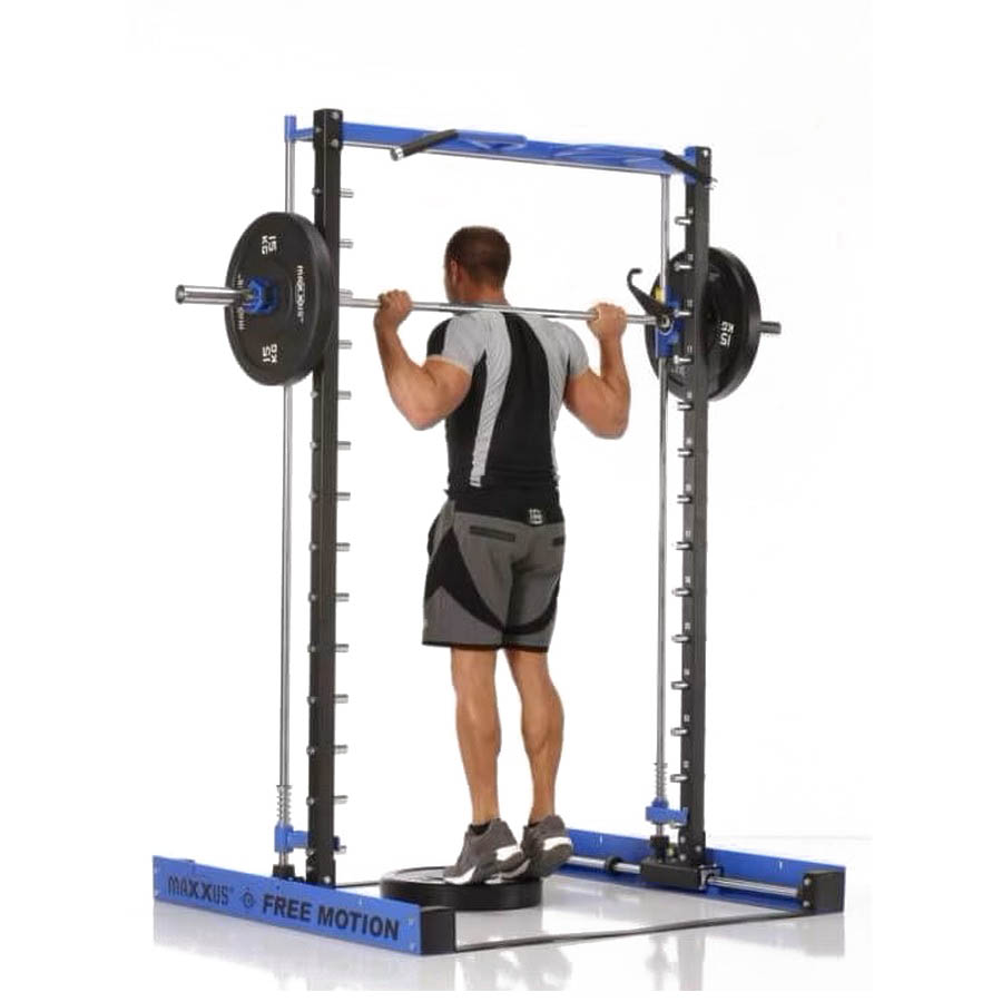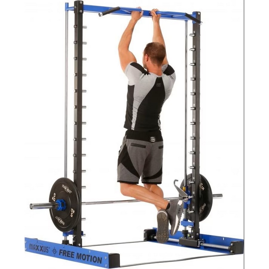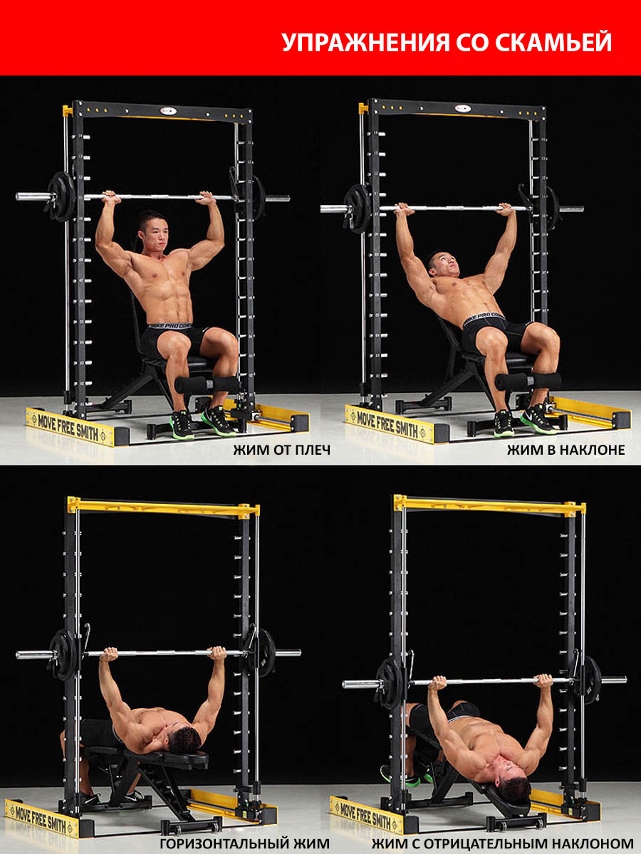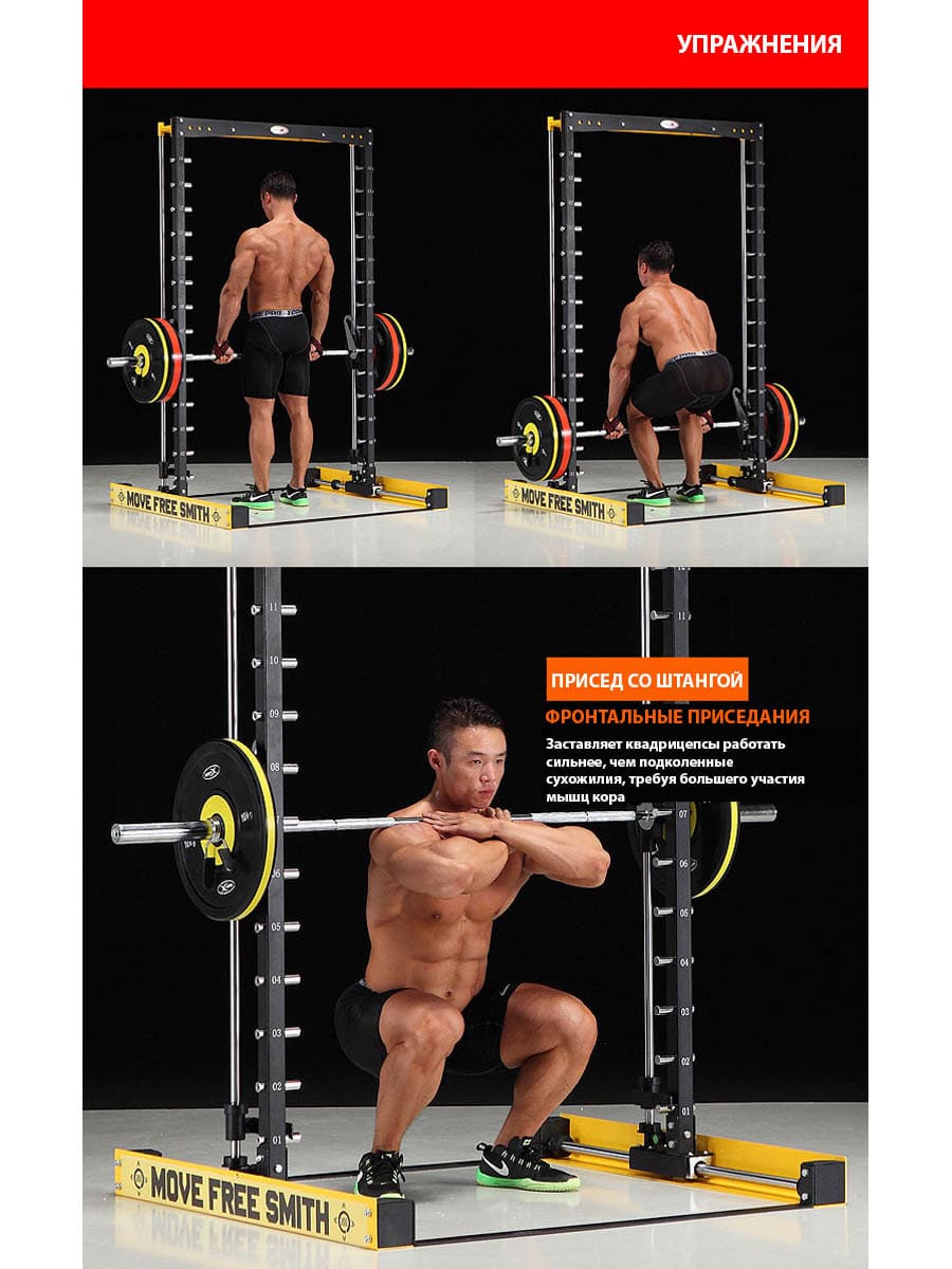 Ход грифа имеет плавные и естественные для анатомии человека движения. Это достигается за счет надежных линейных подшипников и отполированнных стальных направляющих. Безопасность тренировок - основная задача тренажера - под грифом располагаются надежные крюки-стопоры с амортизирующими стальными пружинами. Свободное вращение втулок грифа на шариковых подшипниках позволяет быстро повернуть гриф и зафиксироваться на стальных крюках.
