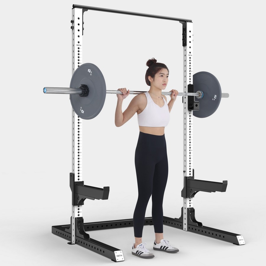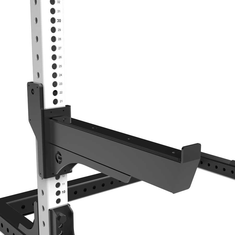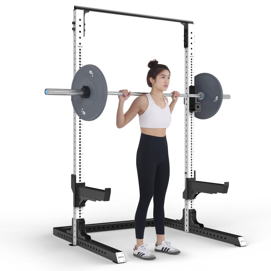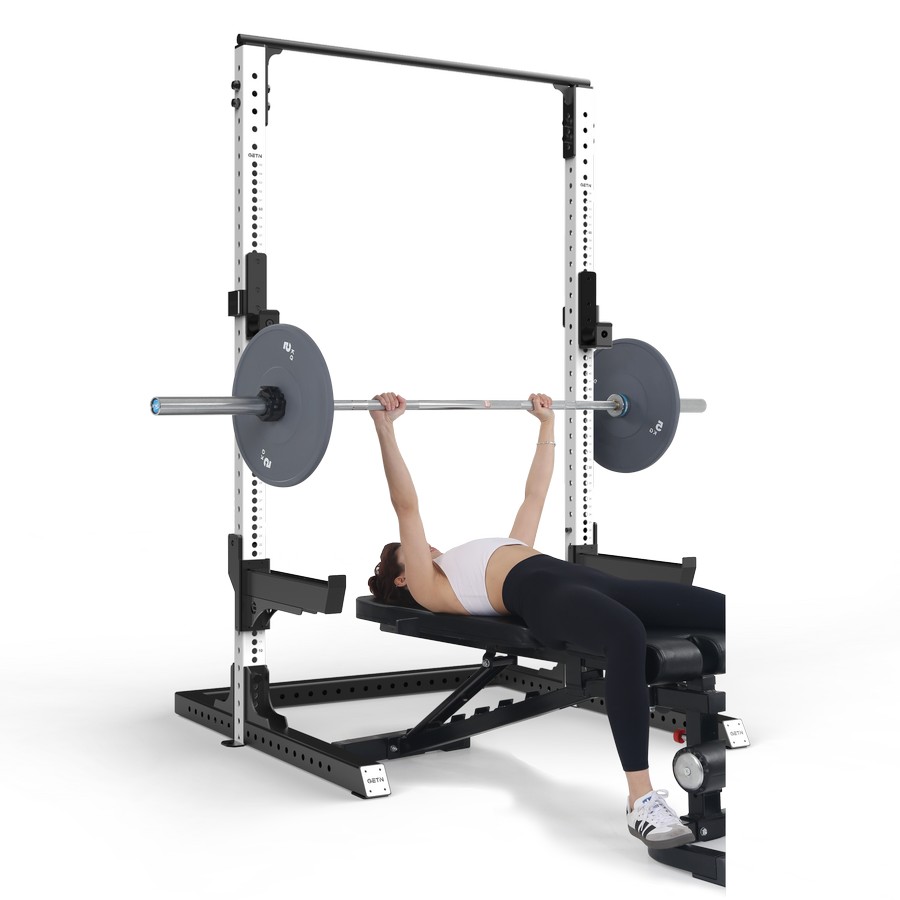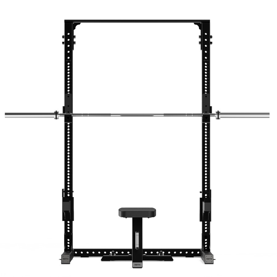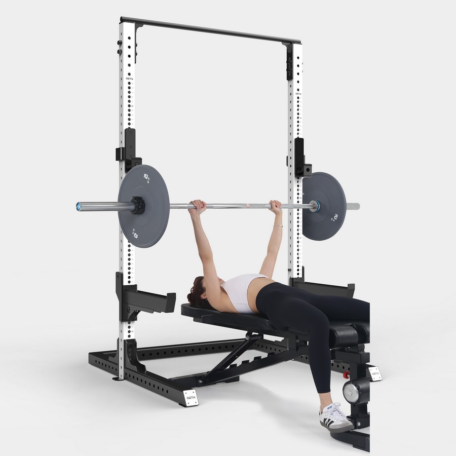 Силовой тренажер предназначен для выполнения упражнений со штангой на разные группы мышц. Рама оснащена j-крюками и страховочными упорами с более чем 65 позициями регулировки, поверхность держателей покрыты ПЭ материалом, который защищает штангу от повреждений. Регулировка вертикальной позиции производится с помощью штырей на держателях и перфорированных отверстий на раме. Наличие большого диапазона регулировок позволяют выполнять на тренажере (в том числе с использованием силовой скамьи) жим лежа, жим лежа под углом, жим сидя, приседания, тяги и прочие упражнения.