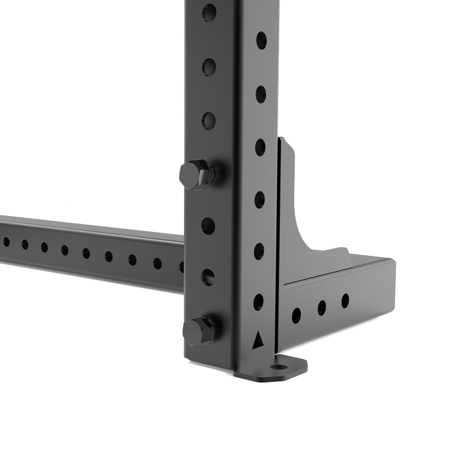 Массивность и устойчивость раме придают 8 хромированных держателей для хранения дисков с резиновыми амортизаторами, защищающими раму и диски от повреждений. Данный силовой тренажер подходит для тяжелоатлетов, пауэрлифтеров и тренировок по кроссфиту. По бокам и на задней части рамы находится 6 проушин с отверстиями для крепления рамы к полу. Силовая полурама выдерживает общий вес нагружения до 2000 кг.
