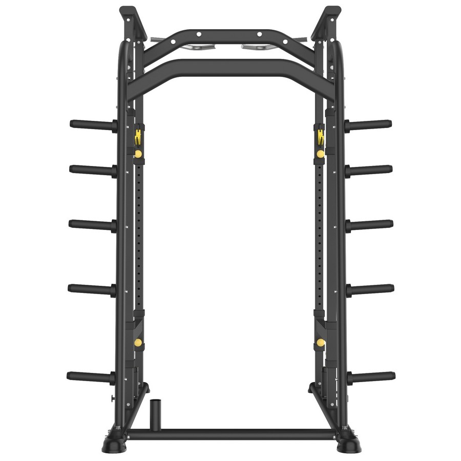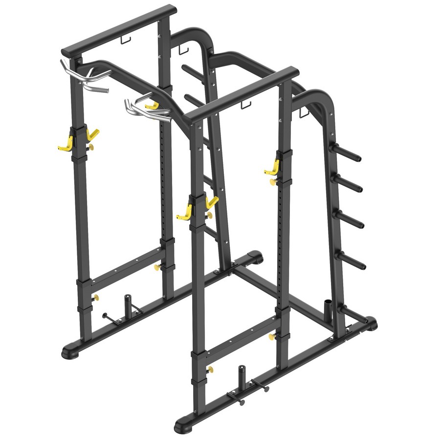 Безопасность упражнений обеспечивается страховочными плинтами с максимальной нагрузкой до 200 кг. Для комфортной работы внутри рамы расположены две пары j-крюков для штанги, и две пары крюков для тренировки снаружи рамы. Плинты и держатели штанги покрыты сменными накладками из ABS-пластика, которые защищают гриф и стальные части тренажера от повреждений. Регулировки высоты производятся с помощью пружинных фиксаторов, которые входят в направляющие отверстия стоек. 26 позиций пронумерованы методом лазерной резки.