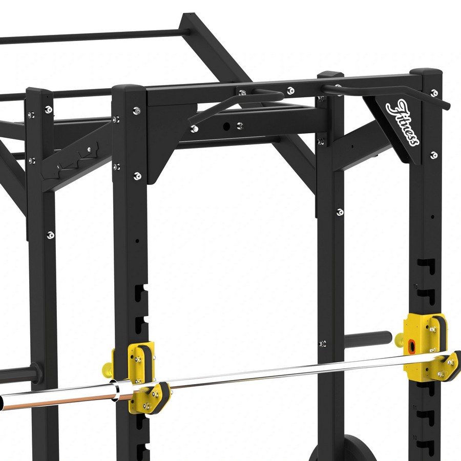 Силовая рама снабжена съемными держателями для штанги с максимальной нагрузкой до 300 кг и страховочными плинтами, которые способны выдержать вес до 300 кг. Для смены высоты держателей или упоров достаточно приподнять и вынуть деталь из стойки. Высота регулируется в 15 позициях. Для защиты грифа крюки для штанги снабжены "сэндвич"-конструкцией с толстой резиновой прокладкой внутри. Плинты покрыты резиновыми накладками.