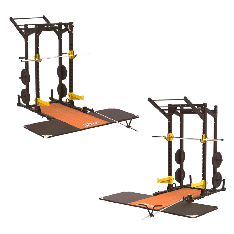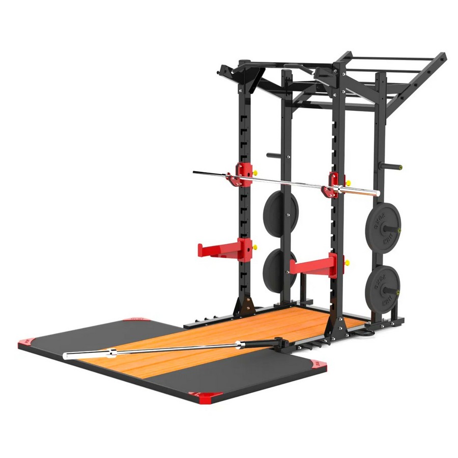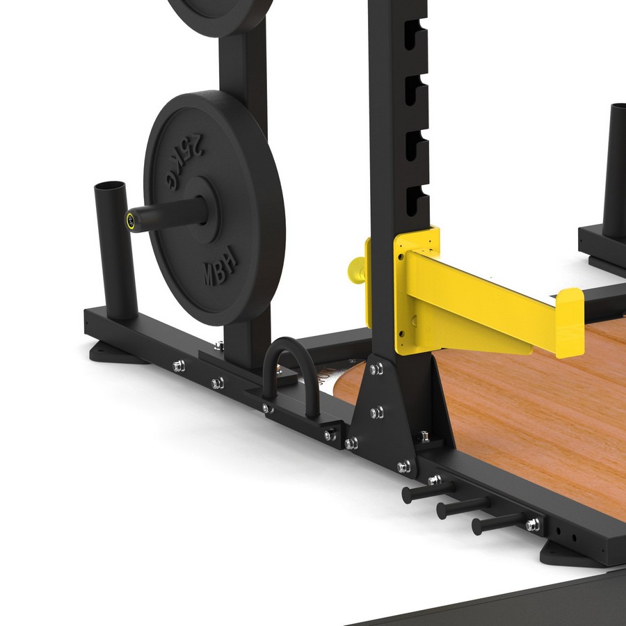 В комплекте с рамой поставляется прочный помост с деревянной центральной частью из массива и боковые резиновые плиты толщиной 3 см - по две с каждой стороны. Деревянная часть помоста позволяет комфортно заходить на упражнение и не скользит, обеспечивая безопасность спортсмена. Боковые плиты амортизируют удар штанги, уменьшают шум и предотвращают отскок снаряда. Края помоста обрамлены прочным стальным профилем с двухслойной порошковой краской. Стальная рама придает структурную целостность конструкции и защищает края от повреждений.