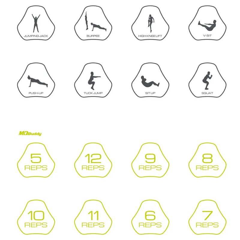 Спортивные игральные кости для фитнеса. Зеленая кость отвечает за упражнение, серая за количество повторений. Количество повторения от 5 до 12. Позволяют весело провести время и позаниматься любимыми упражнениями.