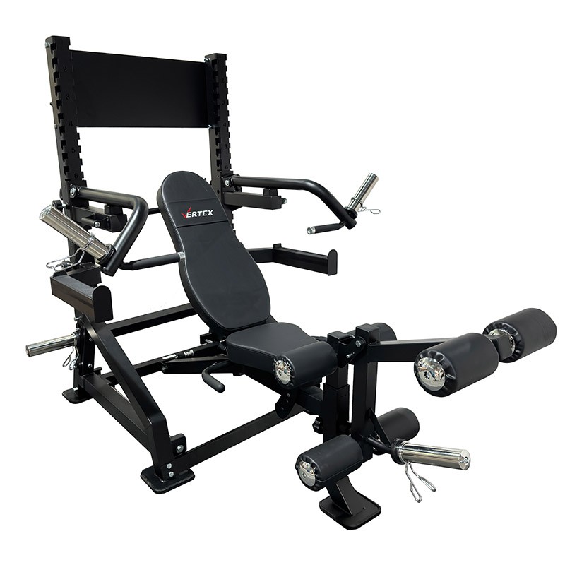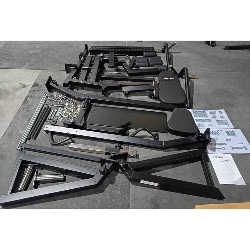 Использование: полупрофессиональное (в залах с ограниченным пространством, со средней интенсивностью использования) и домашнее.Профиль рамы тренажера: разборная конструкция из стального профиля - квадратный 60х60 мм и 50х50 мм, прямоугольный 50х70 мм (страховочные упоры), толщина стенки 2 мм.Цвет рамы: черный матовый.Покрытие рамы: двухслойное, порошковое, методом электростатического нанесения, с предварительной пескоструйной обработкой (с защитой от сколов и коррозии).Мягкие части тренажеры: обивка - 100% ПУ кожа, наполнитель вспененный материал, прошивка - двойная усиленной нитью.Эргономичная спинка и сиденье с контурной формой: наличие.Регулировка угла сиденья: 3 позиции на пружинном фиксаторе с винтовой затяжкой.Регулировка угла наклона спинки: 14 позиций - с положительным и отрицательным наклоном, на пружинном фиксаторе с винтовой затяжкой.Горизонтальная регулировка скамьи: 24 положения, на линейных подшипниках и стальных полированных направляющих, фиксируется стальными стержнями.Съемная часть для сгибания/разгибания ног: 1 шт., со стальным штырем для блокировки свободного хода.Валики для ног: 6 шт., с торцевыми колпачками из ABS-пластика.Съемные рычаги для жима руками: 2 шт., на промышленных подшипниках и стальных втулках, с 2 резиновыми отбойниками, смена позиции на пружинных фиксаторах с винтовой затяжкой.Съемные страховочные плинты: 2 шт., смена позиции на пружинных фиксаторах с винтовой затяжкой.Изменяемая ширина страховочных плинтов: 490 мм и 1260 мм (под короткий или длинный гриф).Кол-во позиций для плинтов и рычагов: 10 шт., пронумерованы методом лазерной резки.Длина втулок нагружения на рычагах и на станции для ног: 205 мм.Адаптеры для хранения дисков: 2 шт., длина 205 мм.Крюки для хранения съемных аксессуаров: 4 шт., стальные.Конструкция: разборная, на болтовых соединения с самостопорными гайками.Складная конструкция: с вертикальным хранением скамьи и подвесными аксессуарами.Вес: 120 кг.Вес в упаковке: 145 кг.Размер в собранном виде (ДхШхВ): 213х143х155 см.Размер в упаковке: 256х66х38,5 см.Объем: 0,65 куб.м.- Бренд VERTEX