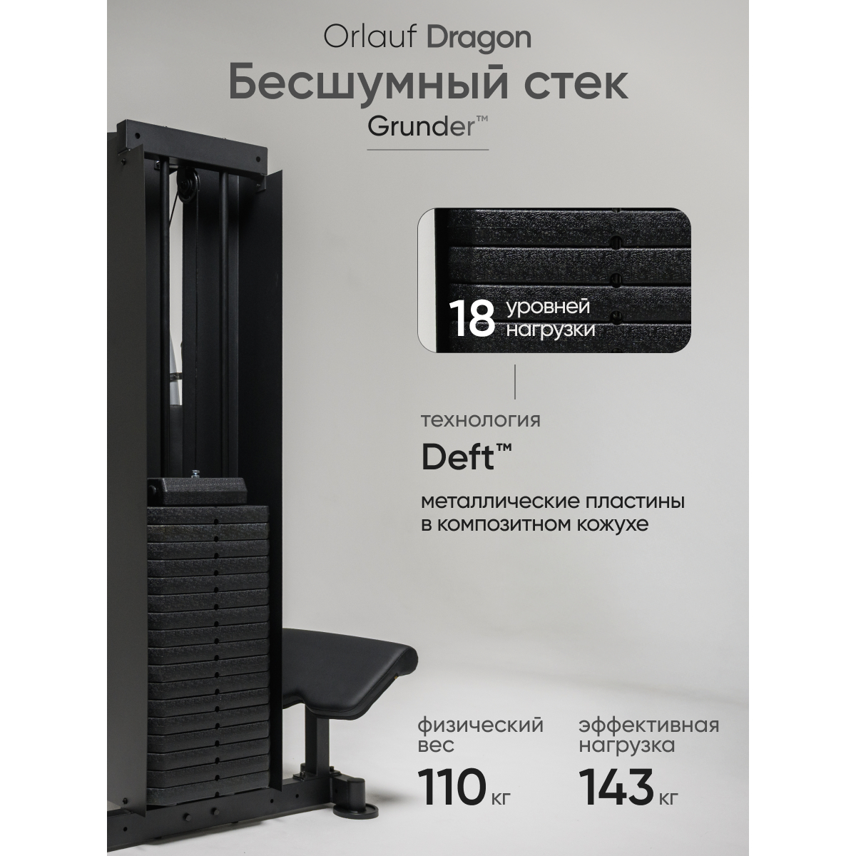 Мощный стек Grunder™ весом 110 кг создаёт необходимую рабочую нагрузку. Благодаря продуманной конструкции эффективная нагрузка достигает 143 кг, обеспечивая плавный, контролируемый ход даже при максимальных весах.