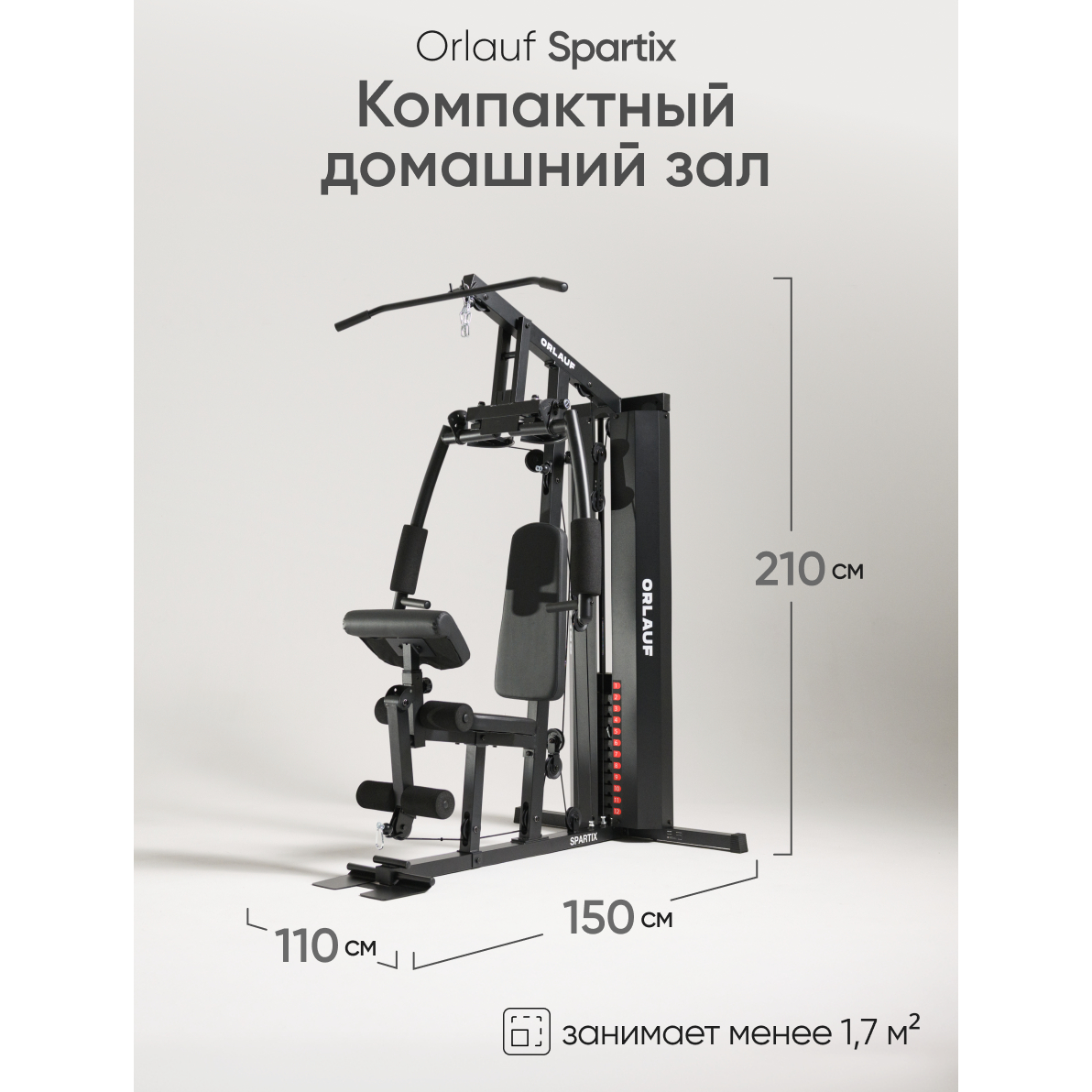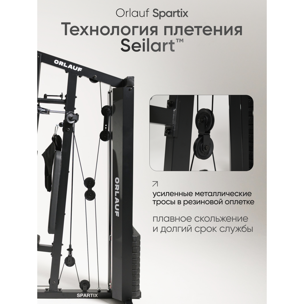 Orlauf Spartix — это профессиональный многофункциональный тренировочный комплекс для дома, который заменяет целый фитнес-зал. Модель оснащена усиленной рамой из особо прочного металла с двойной порошковой окраской, обеспечивающей максимальную устойчивость и защиту от коррозии. Конструкция на пяти опорах и антискользящие накладки гарантируют непоколебимую стабильность даже во время самых интенсивных тренировок.