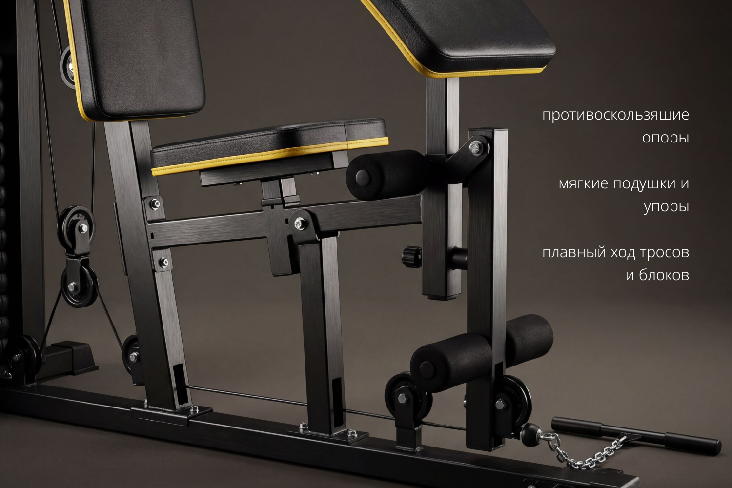 Противоскользящие опоры – предотвращают смещение во время тренировки. Мягкие подушки и упоры – снижают риск травм и повышают удобство. Плавный ход тросов и блоков – естественная амплитуда движений.Простота сборки и эксплуатации