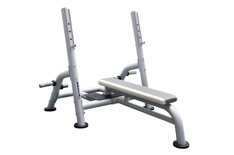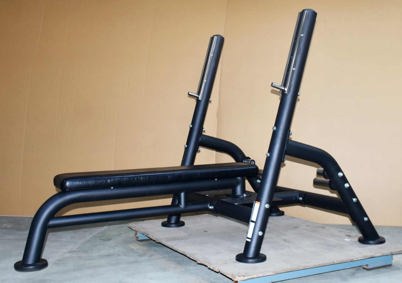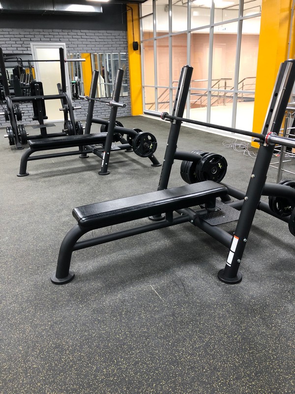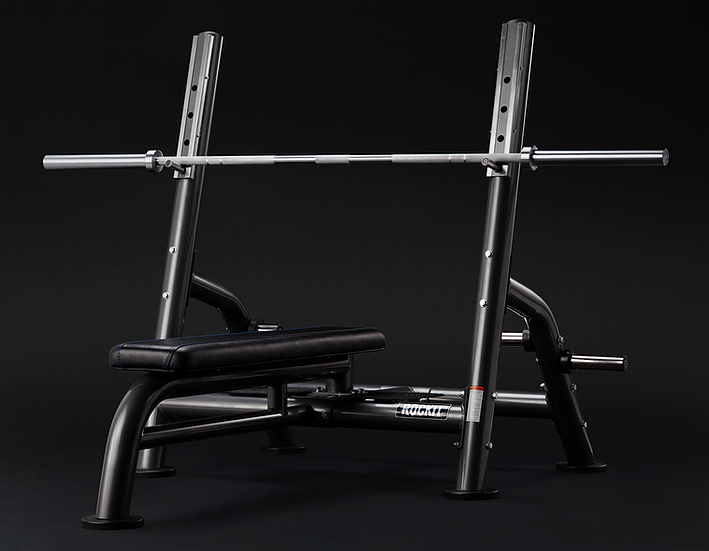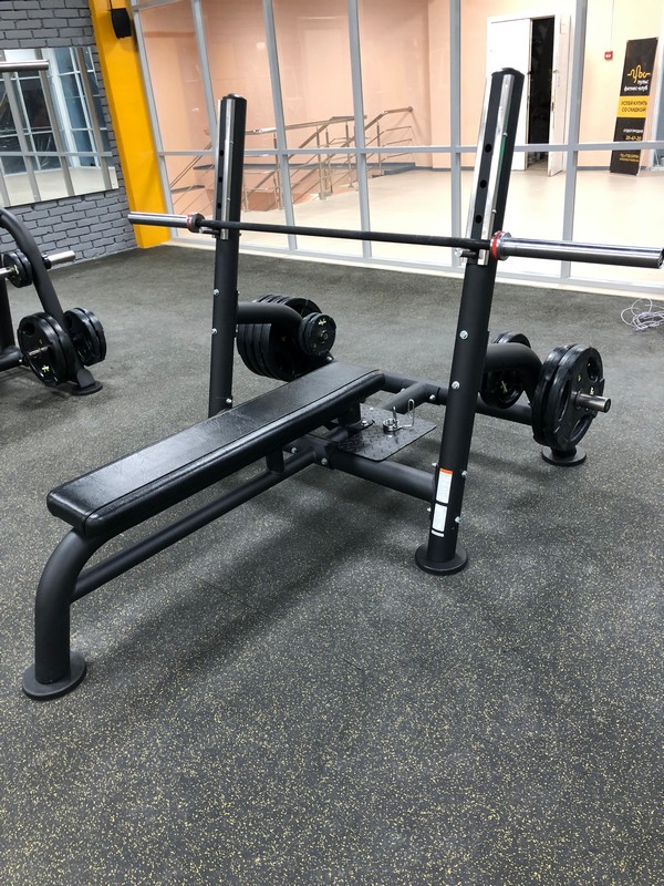 Профессиональная Олимпийская скамья для жима лежа. Основной профиль рамы (сталь 11 калибра): круглый 89х2,5 мм. Максимальная нагрузка, кг: 300. Размер спинки: Длина 1240 мм Ширина 265 мм Толщина 60 мм. Скамья имеет парные держатели, для грифа регулируемые по высоте.